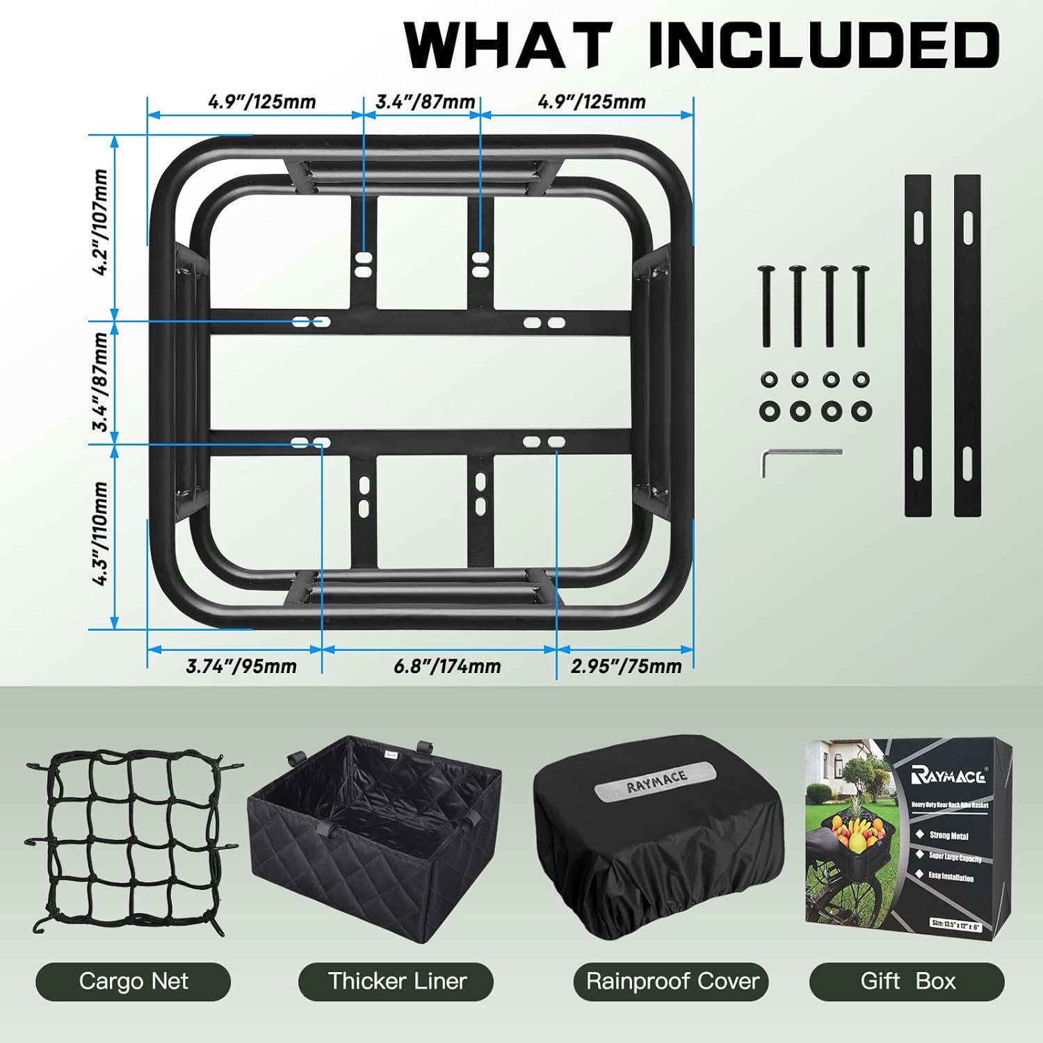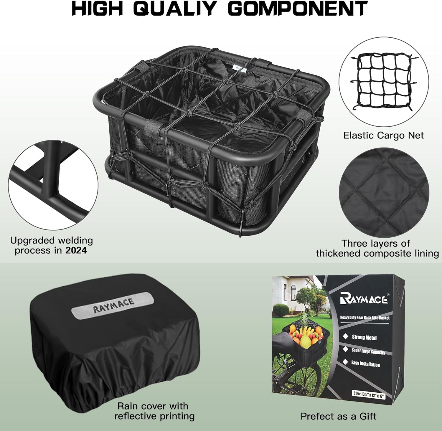 RAYMACE Rear Rack Bike Basket with Cargo Net and Liner Large Bicycle Basket Perfect Mount for Electric Bike