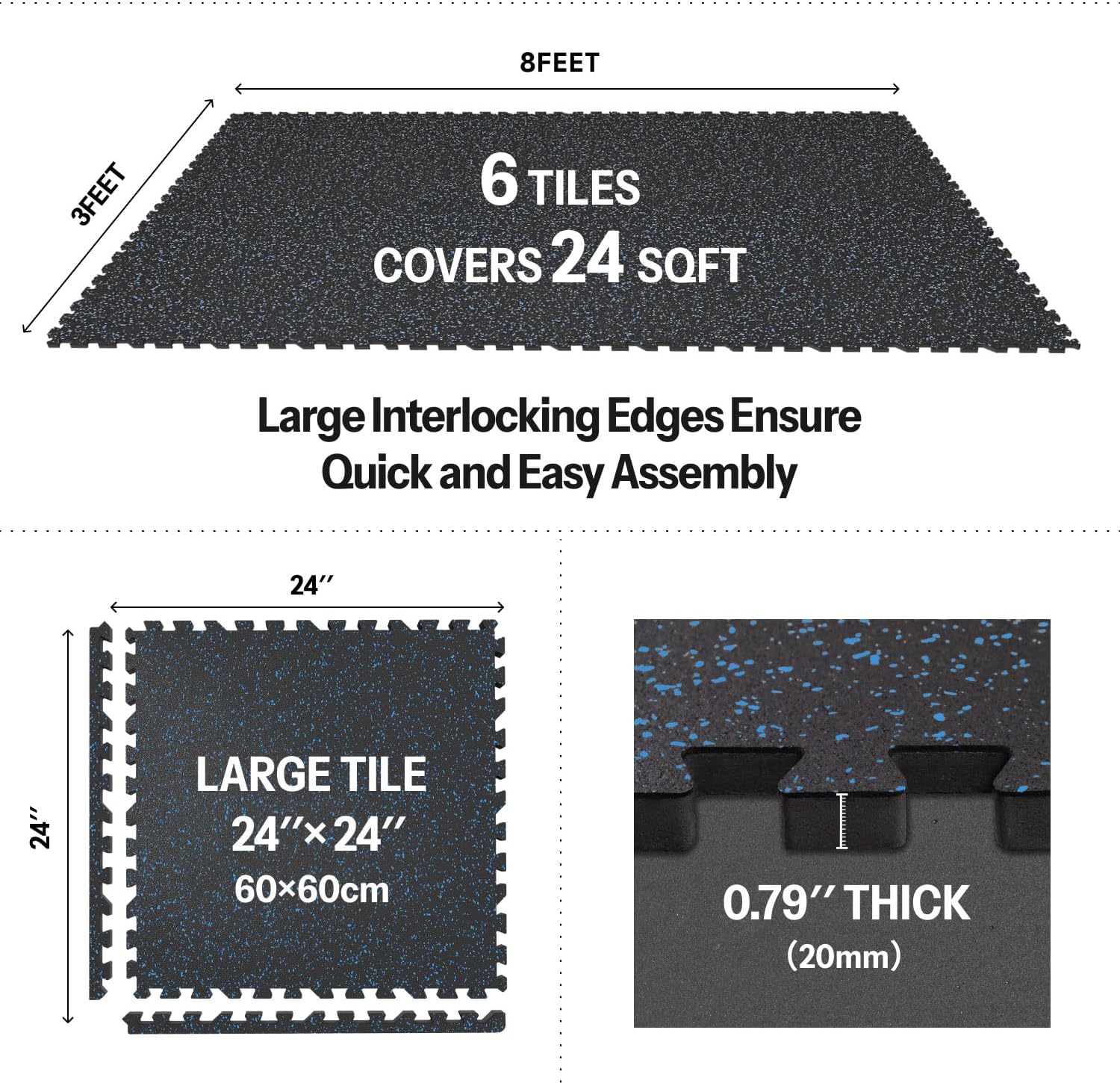 - [Easy to Assemble and Detach]: 6 tiles (24" x 24" x 0.79" each), covers 24 sq ft (6 Ă 4 ft). Upgraded larger interlocking locks provide a secure fit, preventing any separation during use, ensuring you can work out without concerns of shifting. Simple assembly and detachment make it effortless to set up your home gym.