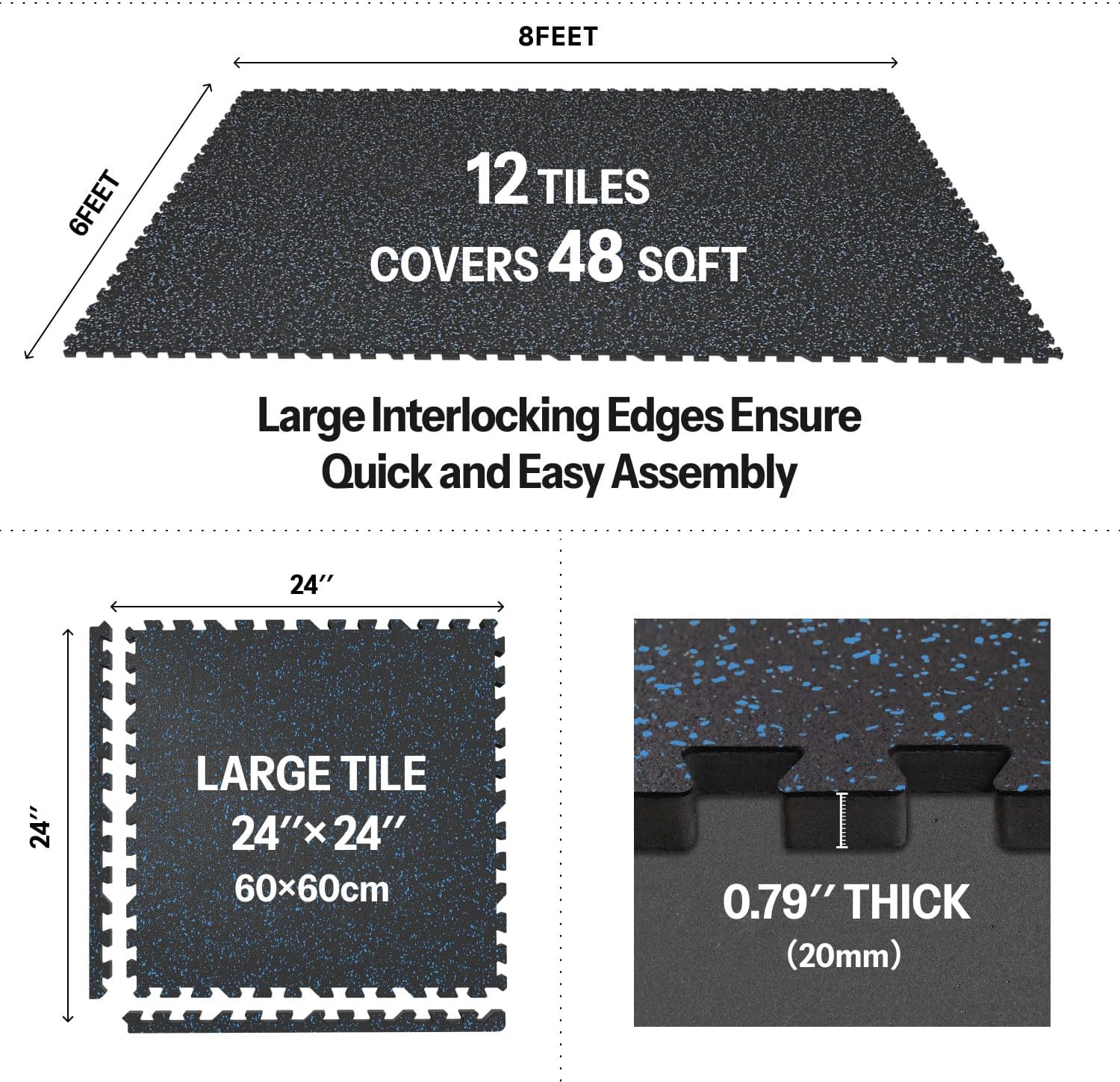 - [Easy to Assemble and Detach]: 12 tiles (24" x 24" x 0.79" each), covers 48 sq ft (8 Ă 6 ft). Upgraded larger interlocking locks provide a secure fit, preventing any separation during use, ensuring you can work out without concerns of shifting. Simple assembly and detachment make it effortless to set up your home gym.