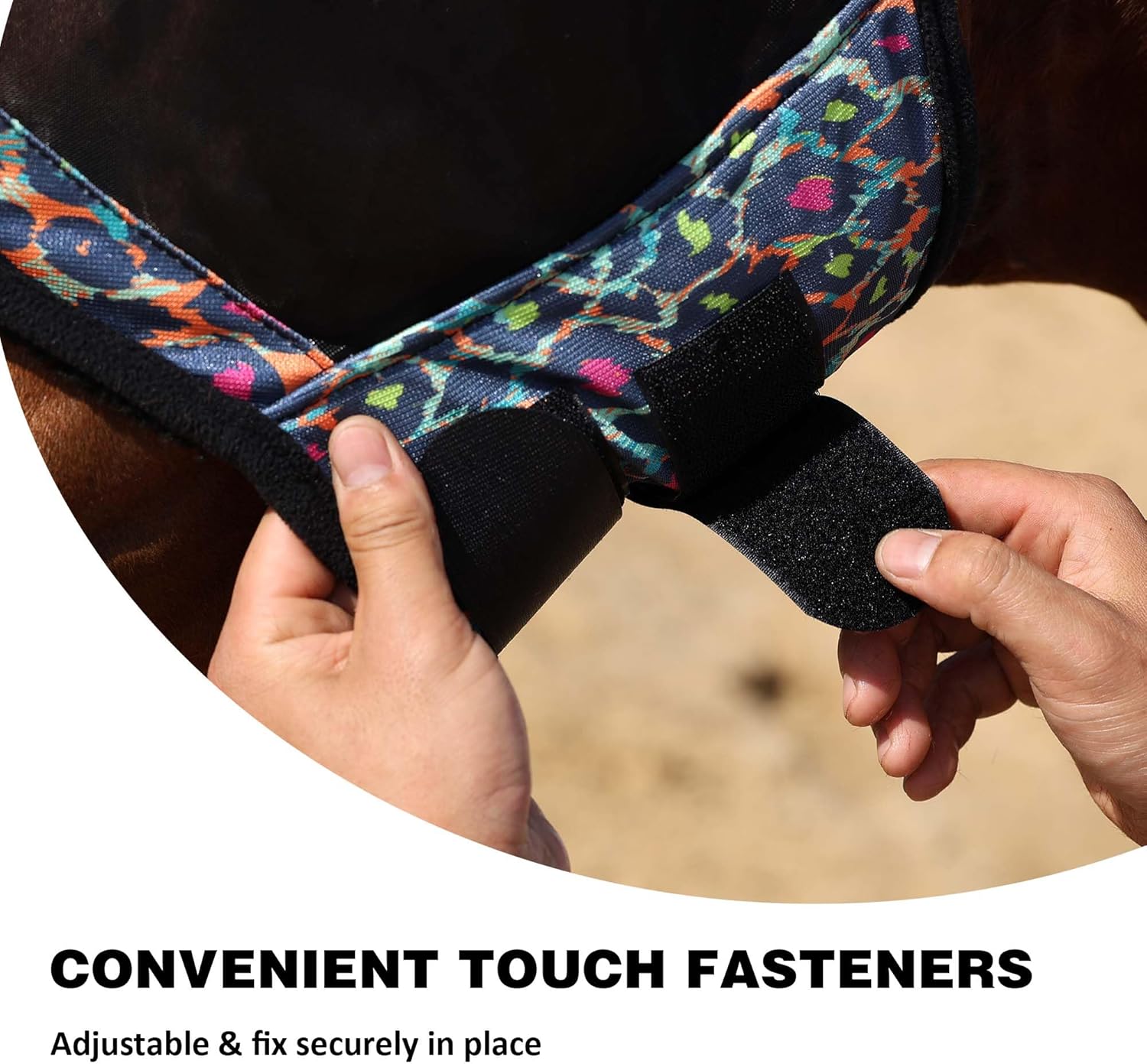 - Secure Fit: Adjustable touch-and-go straps ensure a safe closure for a proper fit. Adjustable touch-and-go closures create a greater size-adjusting ability to help better fit your horse while allowing the mask to stay in place.