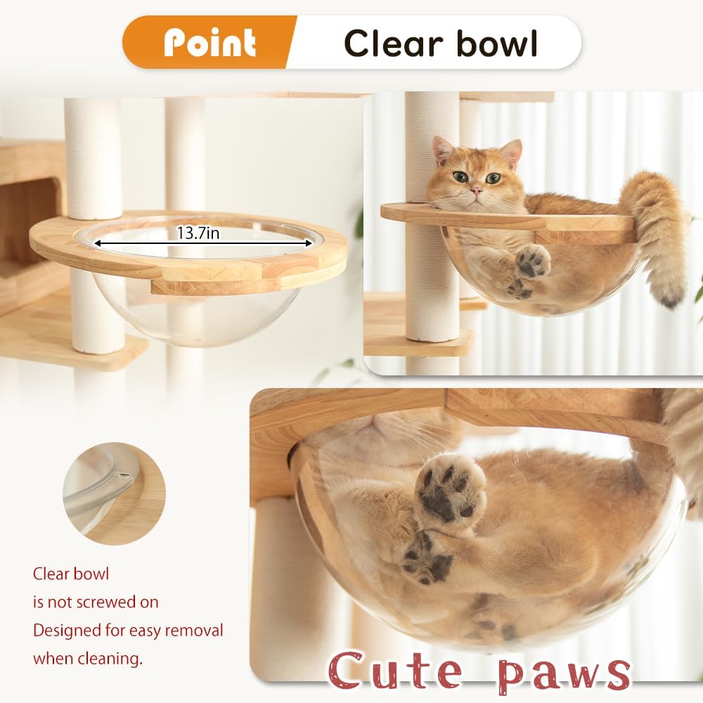 - Private Cat House & Acrylic Bubble Lounge-Includes a cozy wooden cubby with a cute cat-head opening for privacy and an acrylic bubble perch to satisfy your catâs curiosity and love for elevated views.