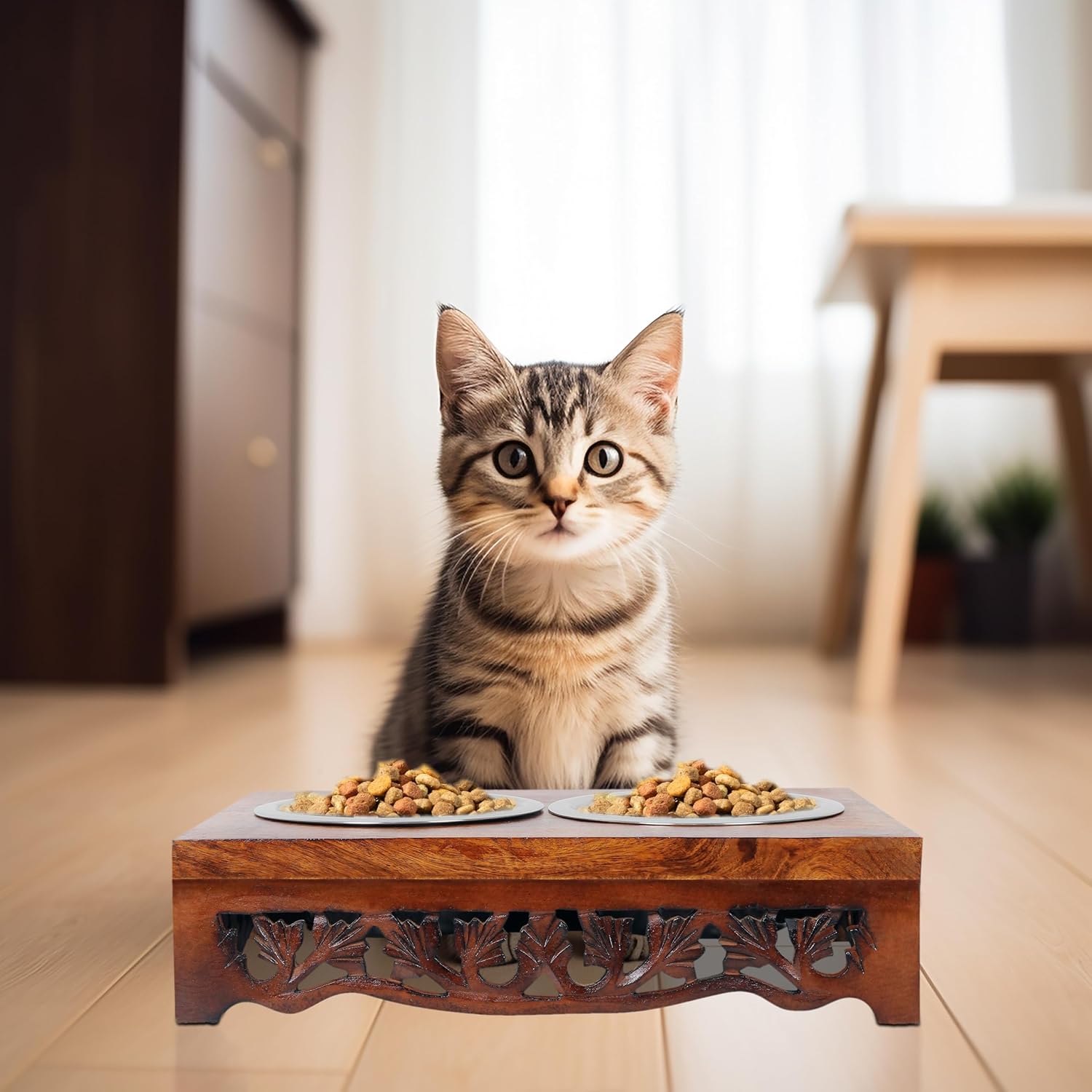 Elevated Pet Feeder for Dogs and Cats - Scroll Carved Wood Raised Dog Bowl Stand - Pet Feeding Stand with Two Steel Bowls - Raised Dog Bowl for Food and Water - Pet Feeding Station -17x11x4- IRONGATE