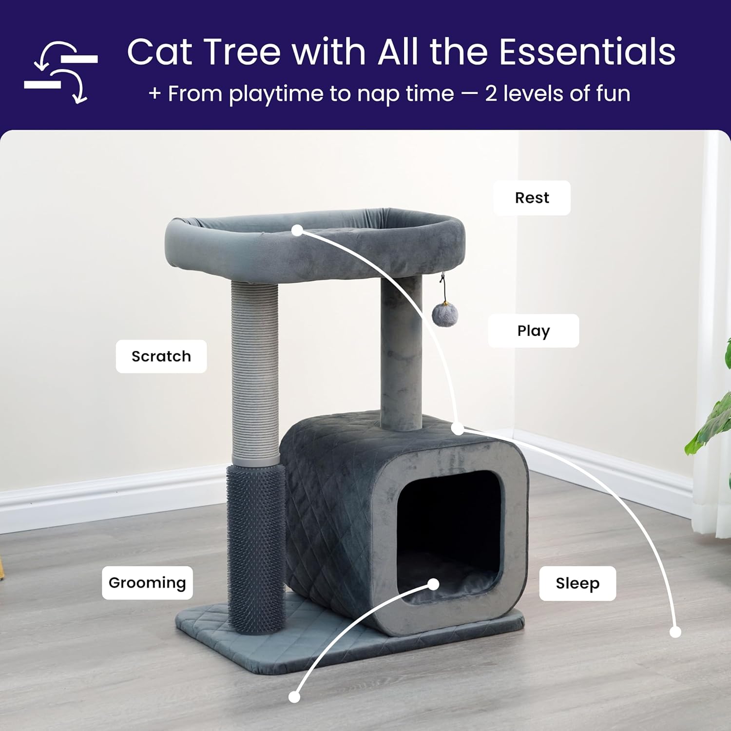 Catry 30" High 3 Level Modern Cat Tree with Large Base Condo,Removable Washable Top Bed, Recycled Paper Scratching Post, Self Grooming Brush, for Small Medium Cat(Dim Gray)