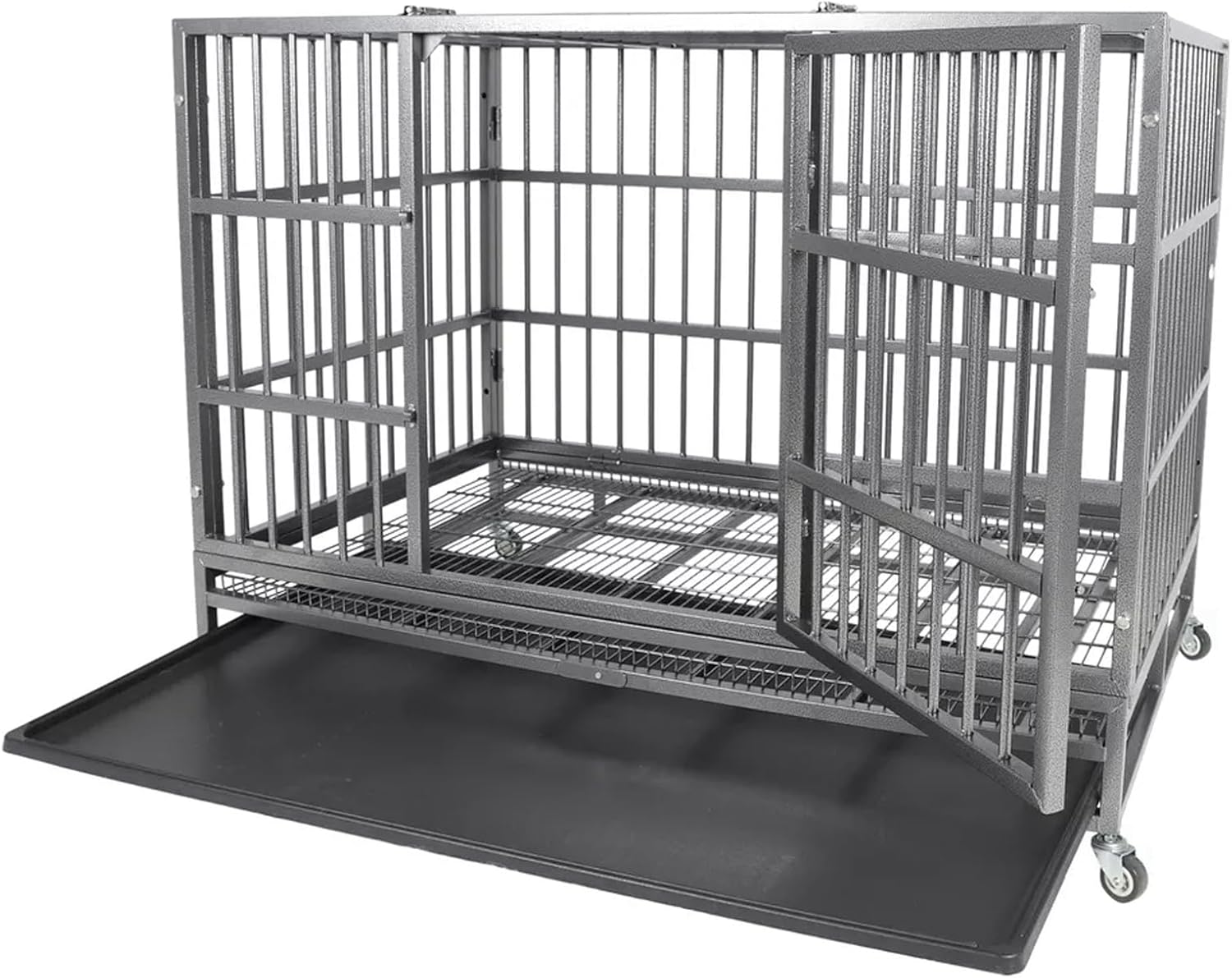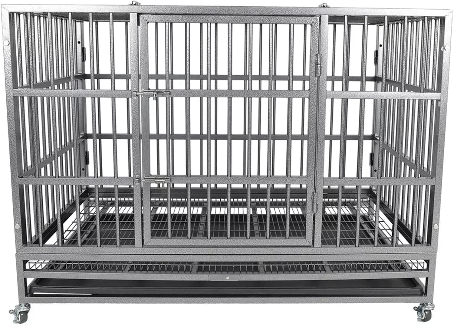 Indestructible Dog Crate Cage Kennel, 47 inches, High Anxiety Dog Crate with Removable Trays, Wheels and Double Door, for Medium and Large Dogs
