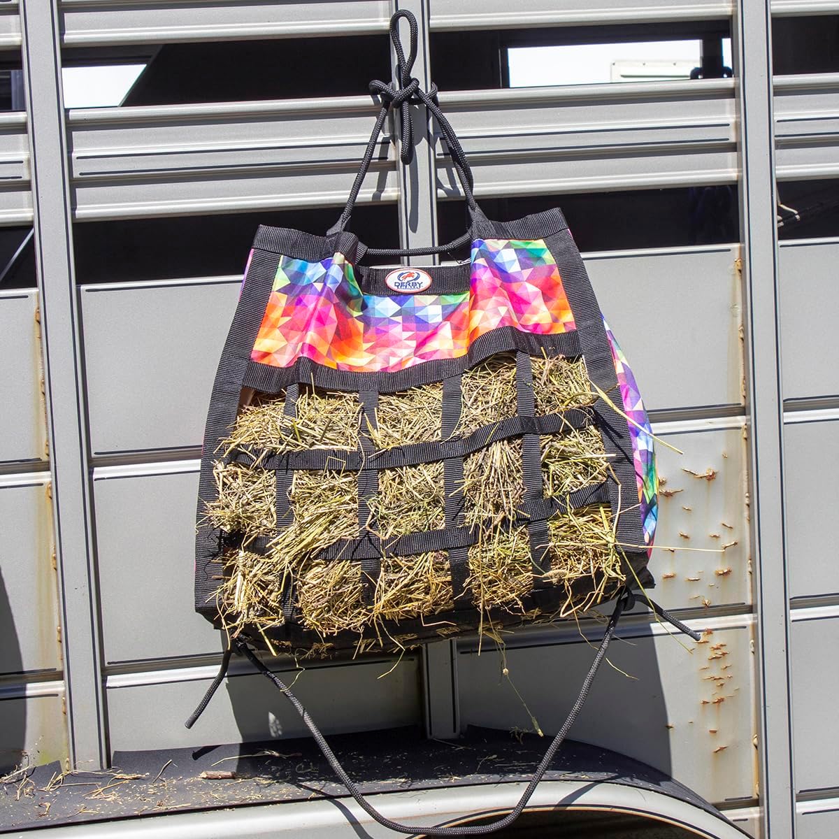 - HOLDS 2-3 FLAKES OF HAY - this 24.5"x9.5"x21.5” hay bag with 3.5" square openings holds approx. 2-3 flakes of Timothy, Orchard, Alfalfa, or any other type of hay. Our hay bags were designed to minimize frustration and can be stuffed in seconds.