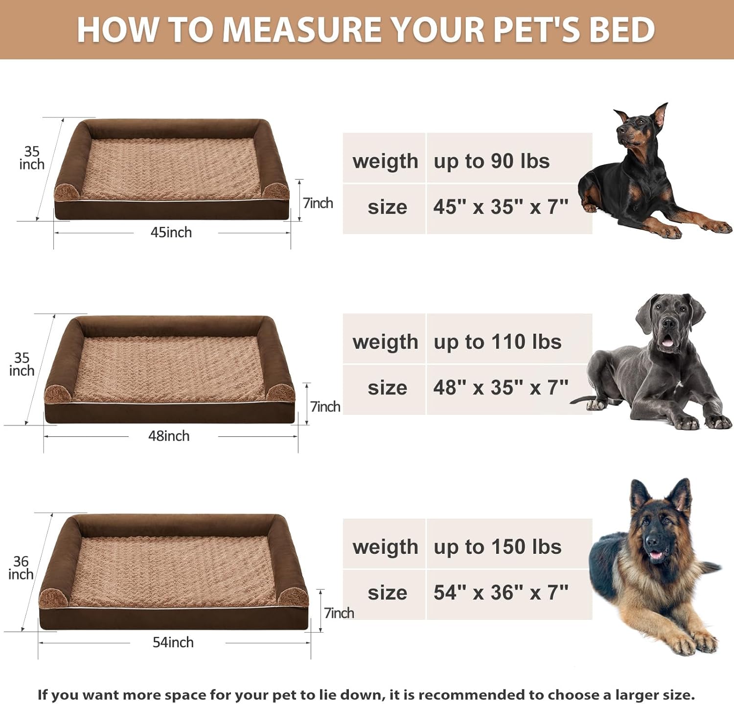 • DIMENSIONS (DOG BEDS FOR MEDIUM DOGS): jumber plus dog bed 54" x 36" x 7" (3.5" bolstered side ) for medium and large dogs up to 150 lbs. For dogs that like to roll around, sizing up will be more comfortable.