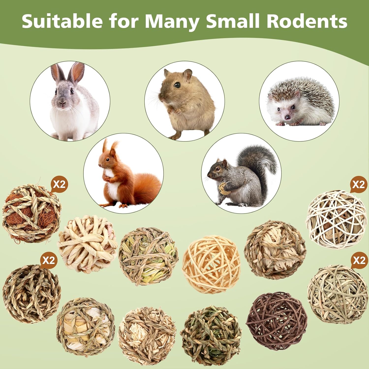 - â¨Our rabbit chewing toy set includes 16 grass balls of different texture, 1*Skinless Rattan Ball, 1*Brown Skinless Rattan Ball, 1*Corn Leaves Ball, 1*Wheat Grass +Seaweed Ball, 1*Seaweed +Corn Husk Ball, 1*Timothy Hay + Seaweed Ball, 1*Skinless Rattan +Seaweed Ball, 1*Seaweed +Corn Silk Ball, 2*Palm Fibers + Seaweed Ball, 2*Reed Ball, 2*Reed +Skinless Rattan Ball, 2*Seaweed Ball. It's a great gift for furry friends.