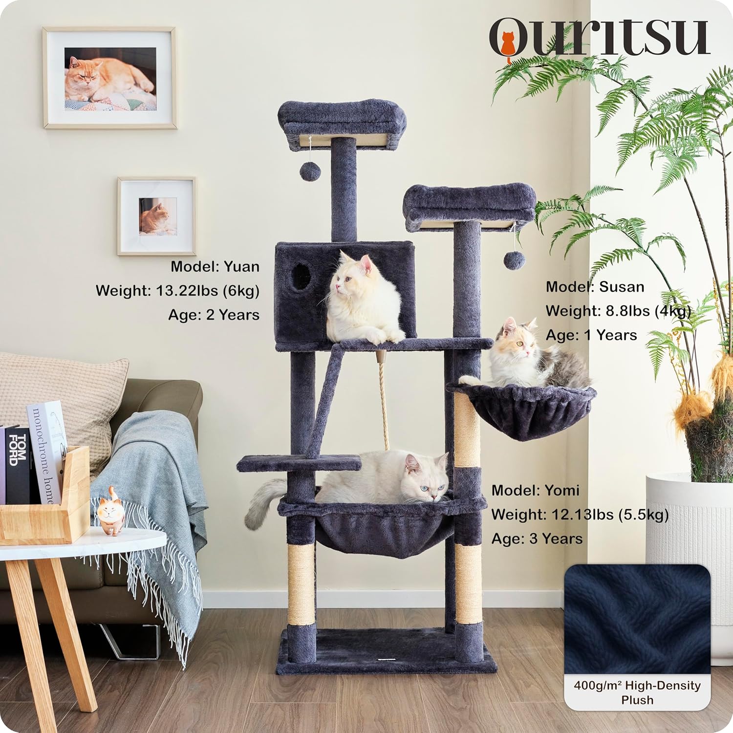 - [All-in-One Comfort & Fun] This cat climbing tower is packed with features and wrapped in soft 400g/m² plush fabric for a cozy experience. The sturdy steel-framed cat tree hammock on the second level offers a secure and comfy resting spot, while the scratching ramp to the third level provides both scratching and easy access for kittens, adult cats, and seniors. A perfect cat tree for indoor cats