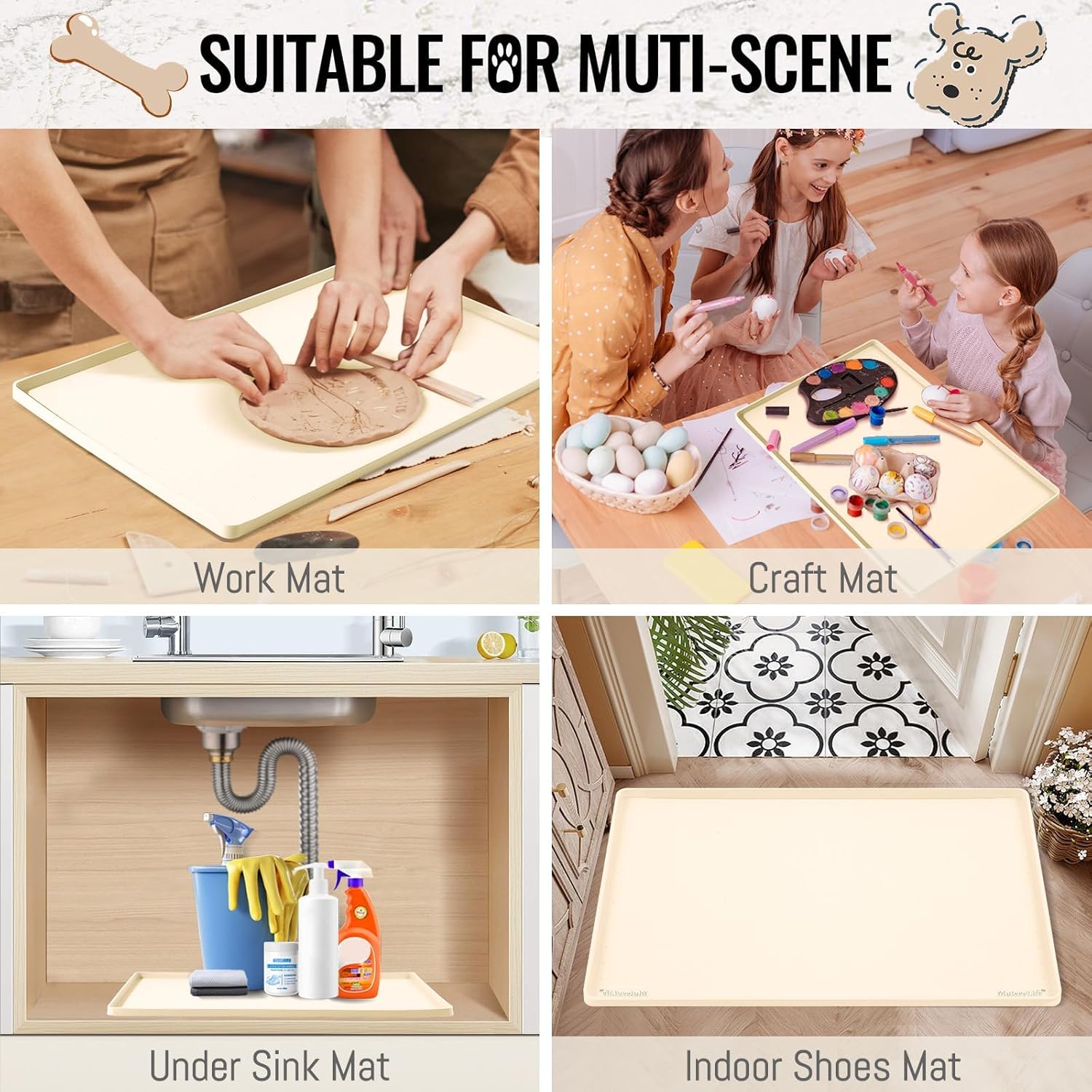 MateeyLife Dog & Cat Food Mat, Waterproof & Nonslip Silicone Feeding Mats for Dogs and Cats, Raised Edge Tray for Messy Drinkers, 22"x14", Beige