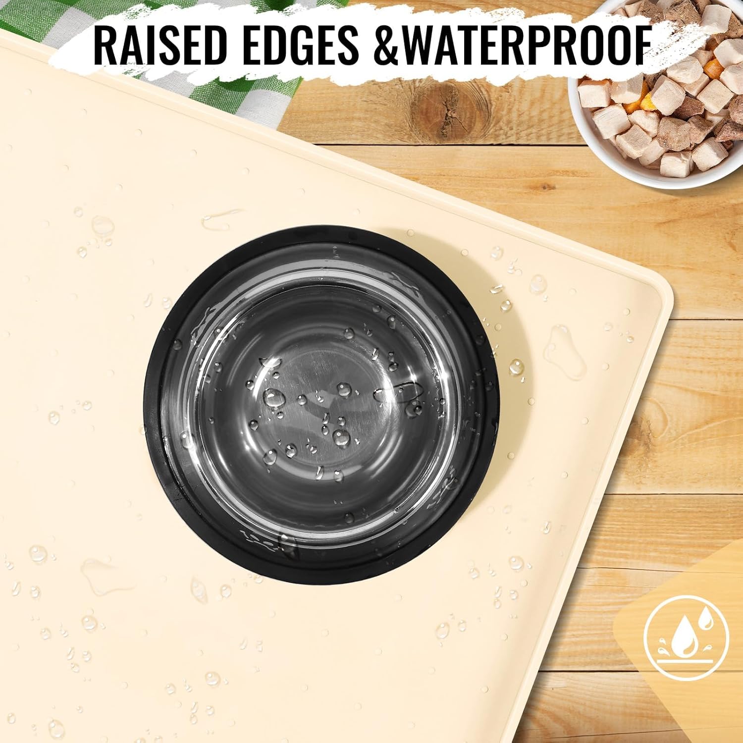 - 100% Waterproof & Keep Biwk in Place: Our silicone pet food mats waterproof with edges, waterproof dog mat for food and water and dog water matt for sloppy drinkers do a great job catching the water and food your puppy drops on the floor. The dot pattern on the surface and nonslip backing of the dog waterproof mat for dog water bowl and anti slip mat for under dog bowls keep your pet's bowl in place, making your pet enjoy his meal more intently and happily