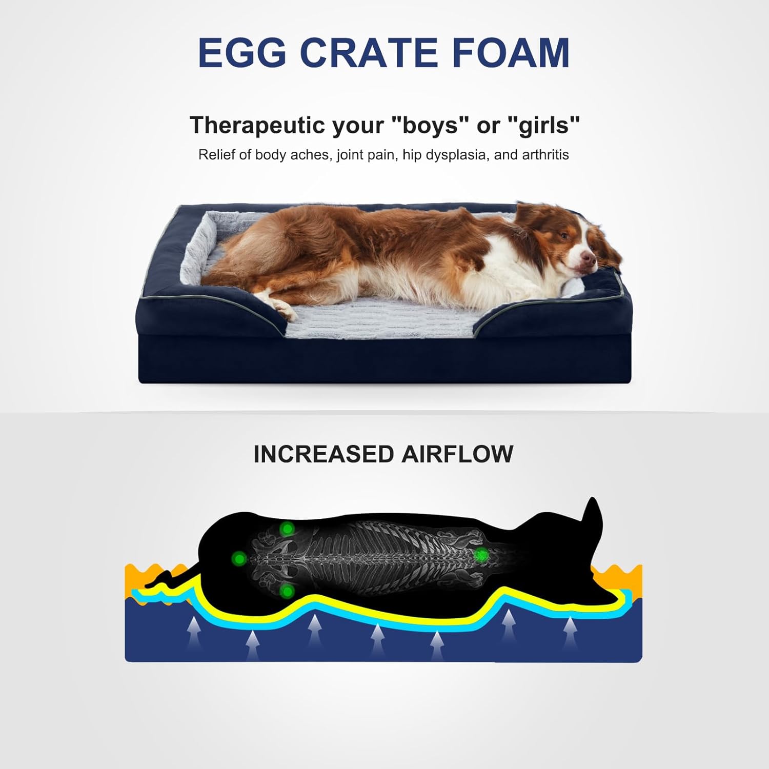 - Orthopedic Support: Our orthopedic dog bed features high-density egg foam to relieve pressure points, helping to evenly distribute weight and providing great support for painful joints and muscles. While fluff-filled bolsters support the neck, back, hips, and joints; helps ease discomfort and promote restful sleep.