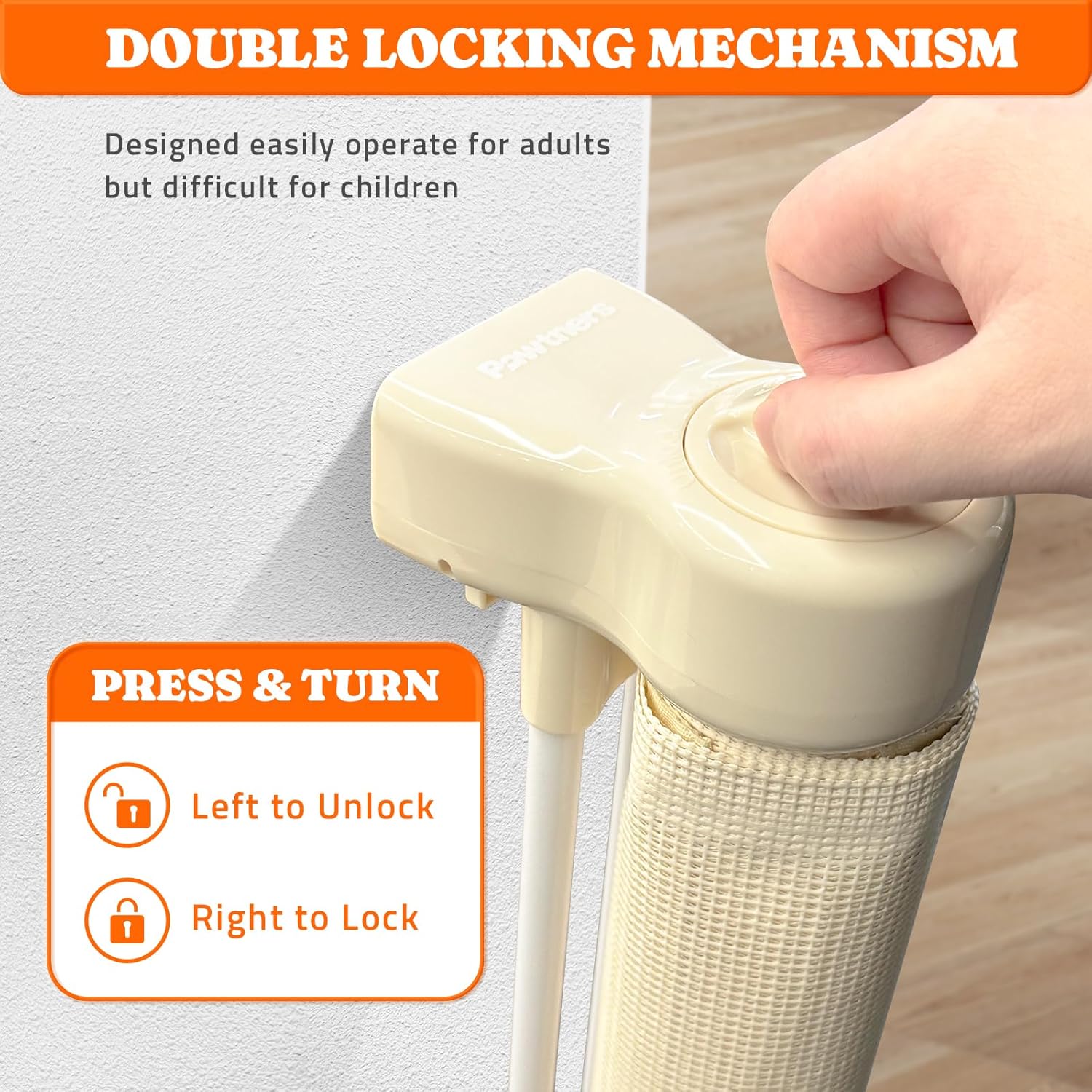 - Double Locking Mechanism: The knob (Press & Turn Design) at the top of the baby gate with cat door, especially the tall baby gate, ensures easy use for adultsâopen and close with one hand. Meanwhile, curious little ones won't be able to unlock this secure safety gate