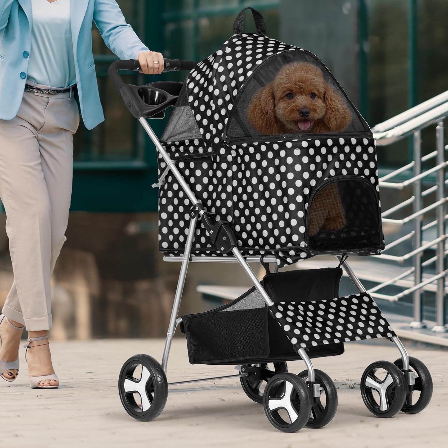 - Convenient Storage for Essentials: Equipped with a built-in cup holder and a spacious undercarriage storage basket, this stroller allows you to carry pet essentials, personal belongings, and refreshments with ease, keeping everything organized during your journey