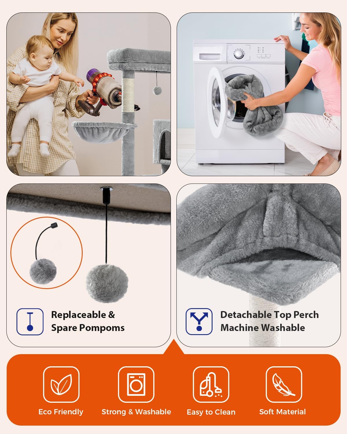 - Reliable Quality: Stability and safety are always the key points. Crafted by soft plush fabric, CARB-certified natural particle boards, firm sisal wrapped posts and strengthened base, itâs sturdy and safe for fat and heavy cats to bounce and enjoy up on their castle with ease