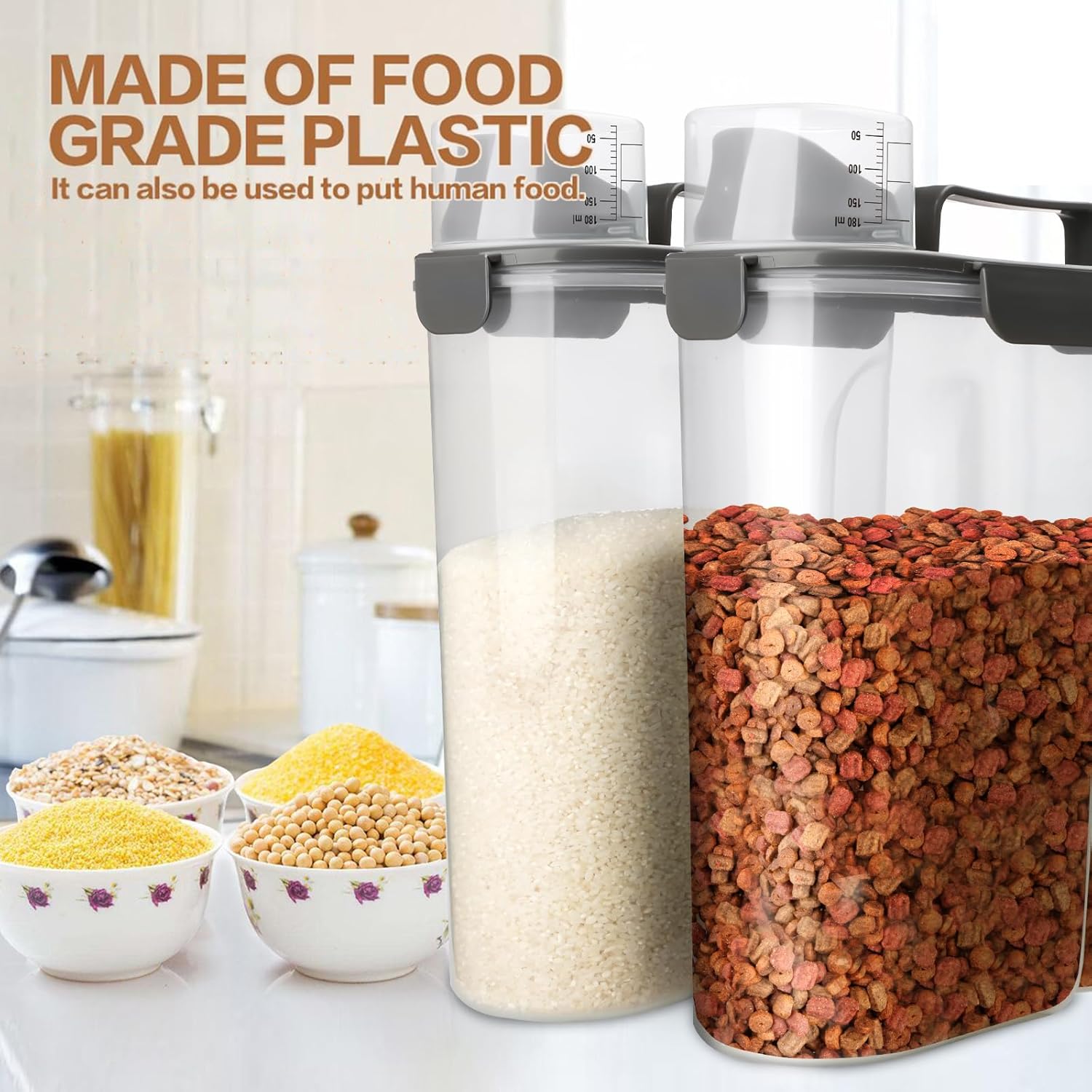 - 2 PACK Pet Dry Food Storage Container - It come with a 6Qt and a 3Qt Dog Food Container. The 6Qt dog food container can hold about 5lb pet food or 10lb rice. The 3Qt dog food container can hold about 3lb pet food or 5lb rice. It also works well for regular kitchen food. Such as rice, flour, cereal, beans, nuts, snack and more