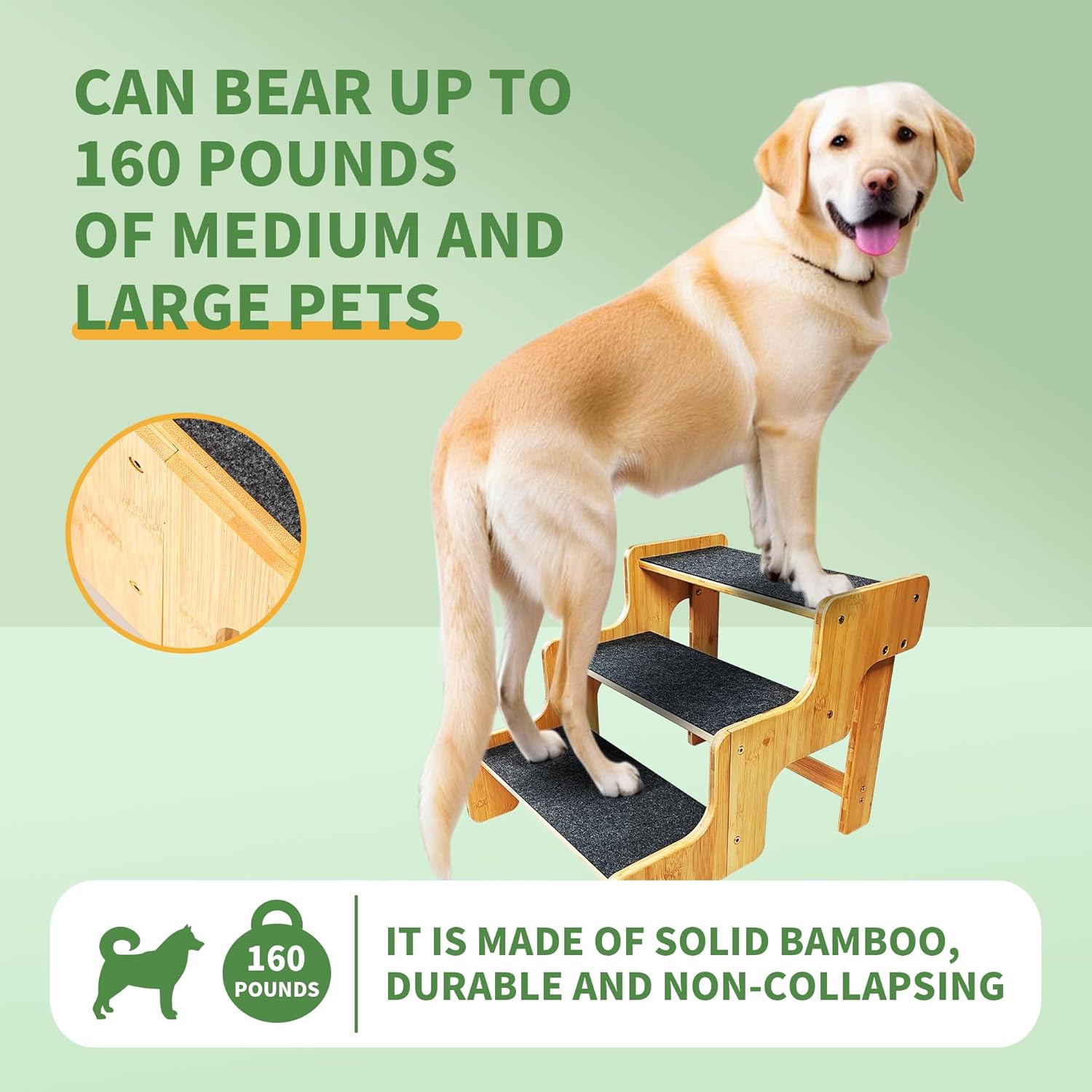 - [Natural Bamboo]The newest design of small dog steps are made of natural bamboo material. Each step tread in contact with the ground,are equipped with abrasion non-slip felts. With good thickness makes the dog stairs supportiveăsturdy and durable. At the same time, the dog stair stable structural design adopts all kinds of small and medium-sized dogs oldder pets and cats.