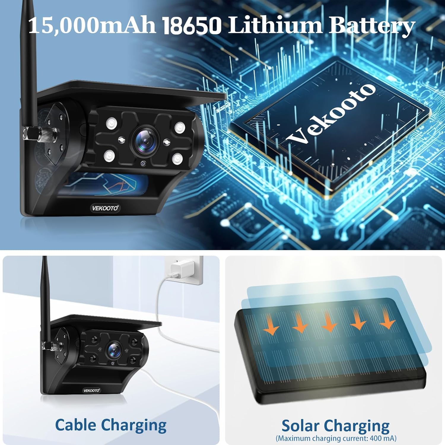 - ă15,000mAh Battery & True Solar ChargingăThe solar backup camera is upgraded with a powerful 15,000mAh rechargeable battery and an integrated high-efficiency solar panel. It offers up to 30 hours of continuous operation. The magnetic camera supports fast Type-C charging, and the high-efficiency monocrystalline solar panel can provide up to 400mA of current to keep the battery charged