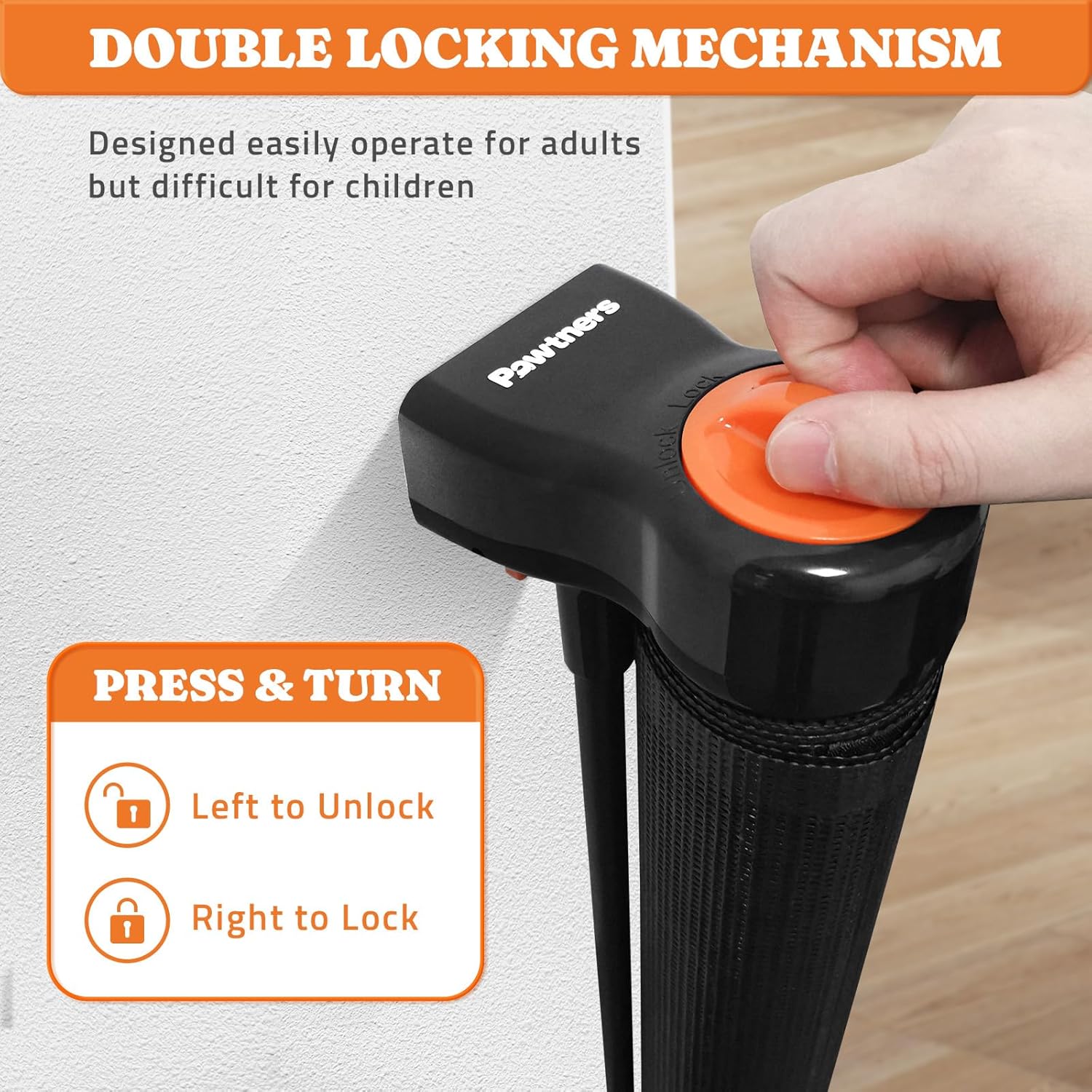 - Double Locking Mechanism: The knob (Press & Turn Design) at the top of the baby gate with cat door, especially the tall baby gate, ensures easy use for adults--open and close with one hand. Meanwhile, curious little ones won't be able to unlock this secure safety gate