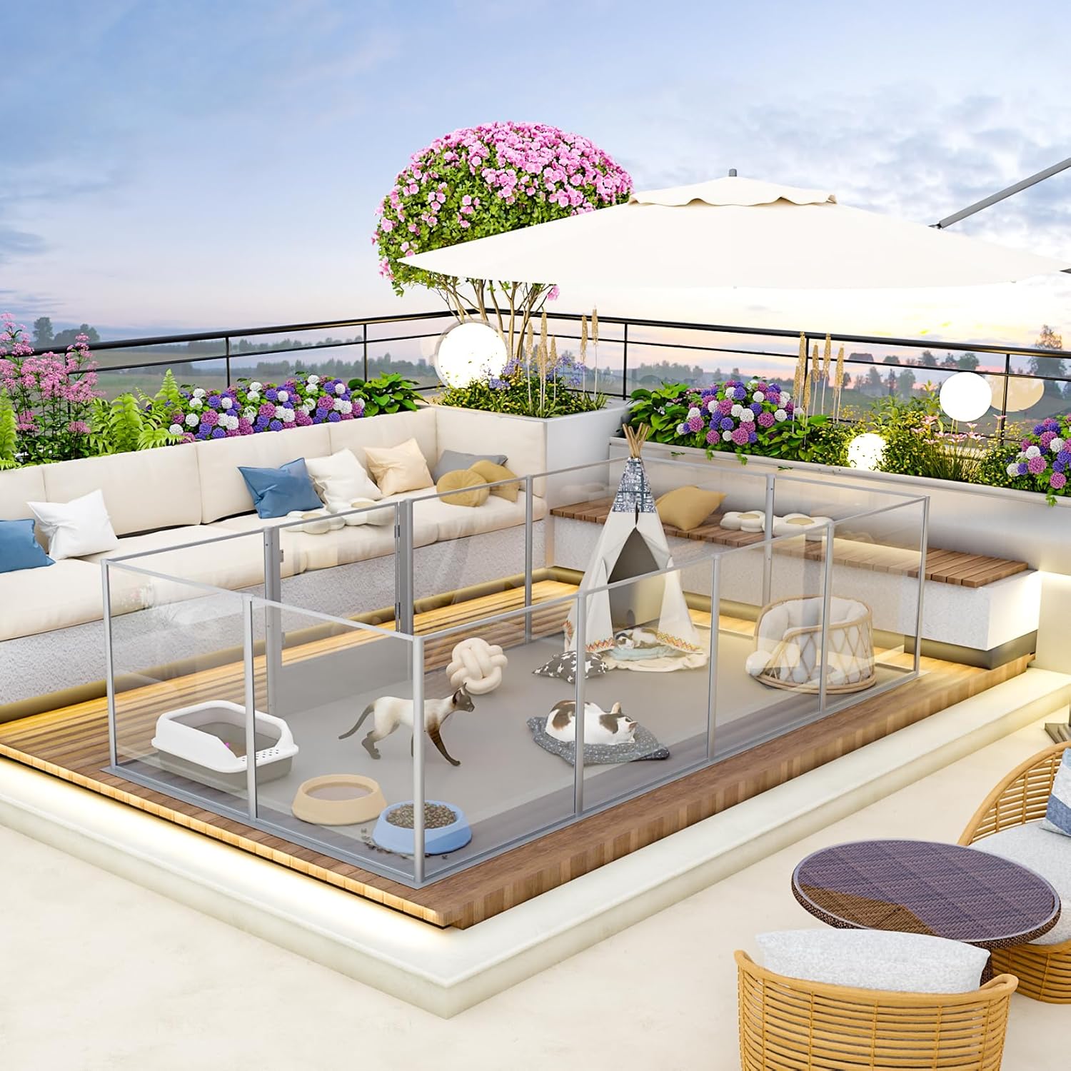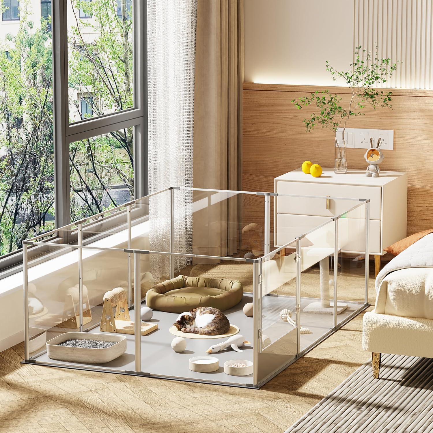 - Clear Acrylic Fence Design - Crystal-clear acrylic dog fence playpen enables you can interact with your pets closely, 360°high transparency and wide vision, itâll relieve your pets from anxiety, they also make sure you are by their side, equipped with a door for dog mom/ pets to come and go easily, so this is a unique gift for your loved friends, get this fence in the room, instantly upgrade your home space