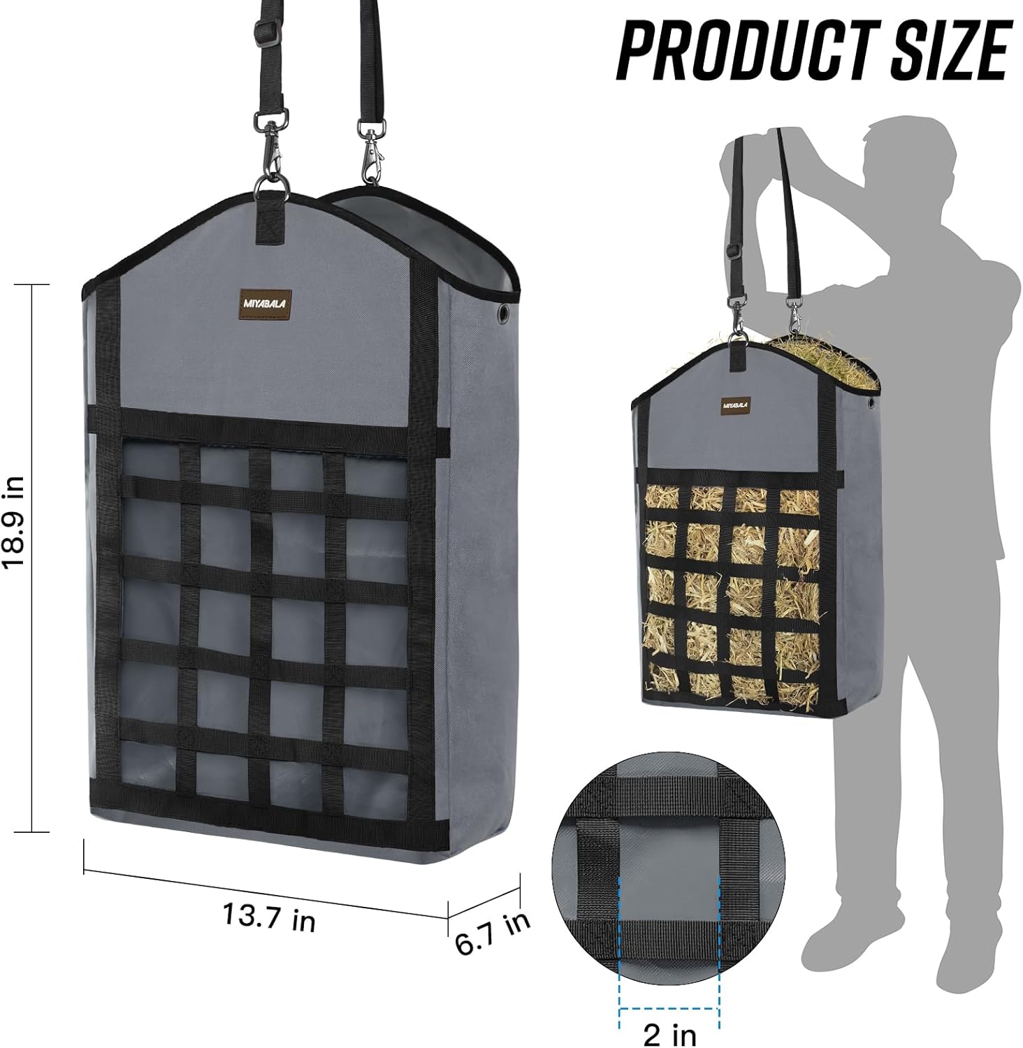 - Innovative Slow Feed Net: Featuring an innovative slow feed hay feeder for horses on the front panel, these horse hay bags promote healthy eating habits for horses. This design helps to regulate hay consumption, encouraging natural grazing behavior while preventing overeating, thereby supporting digestive health and overall well-being.