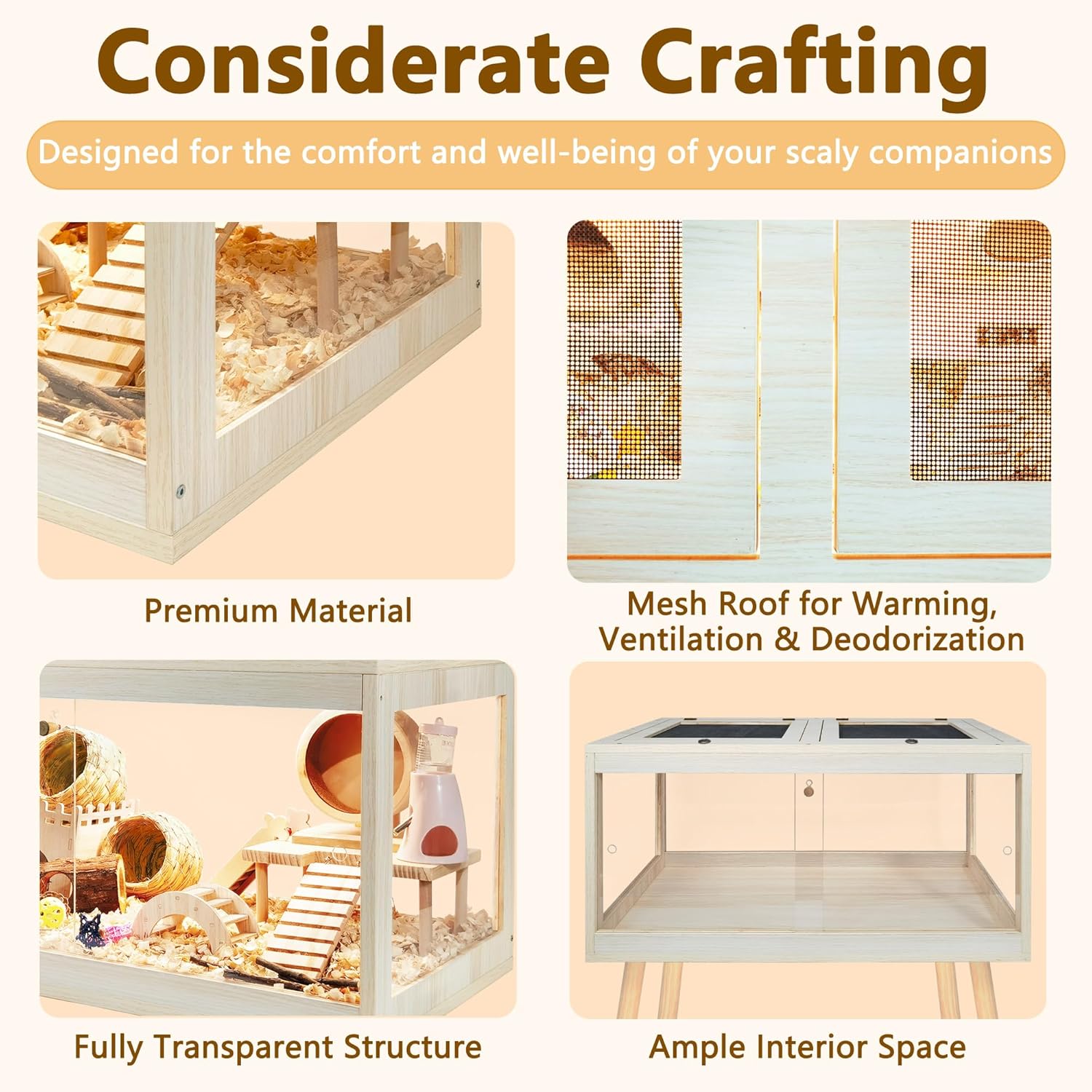 - 【Premium Quality Materials】Available in 4 sizes ranging from 24 to 48 inches in length, with 24 or 27.5 inches legs' height, please refer to picture 2 for size information. Crafted from durable, high-density natural wood treated with a rot-resistant, waterproof coating, our cage ensures longevity and aesthetic appeal. Transparent acrylic panels provide a clear view of your cherished hamsters' activities. An additional acrylic sheet on the cage bottom prevents moisture buildup, simplifying cleaning tasks.