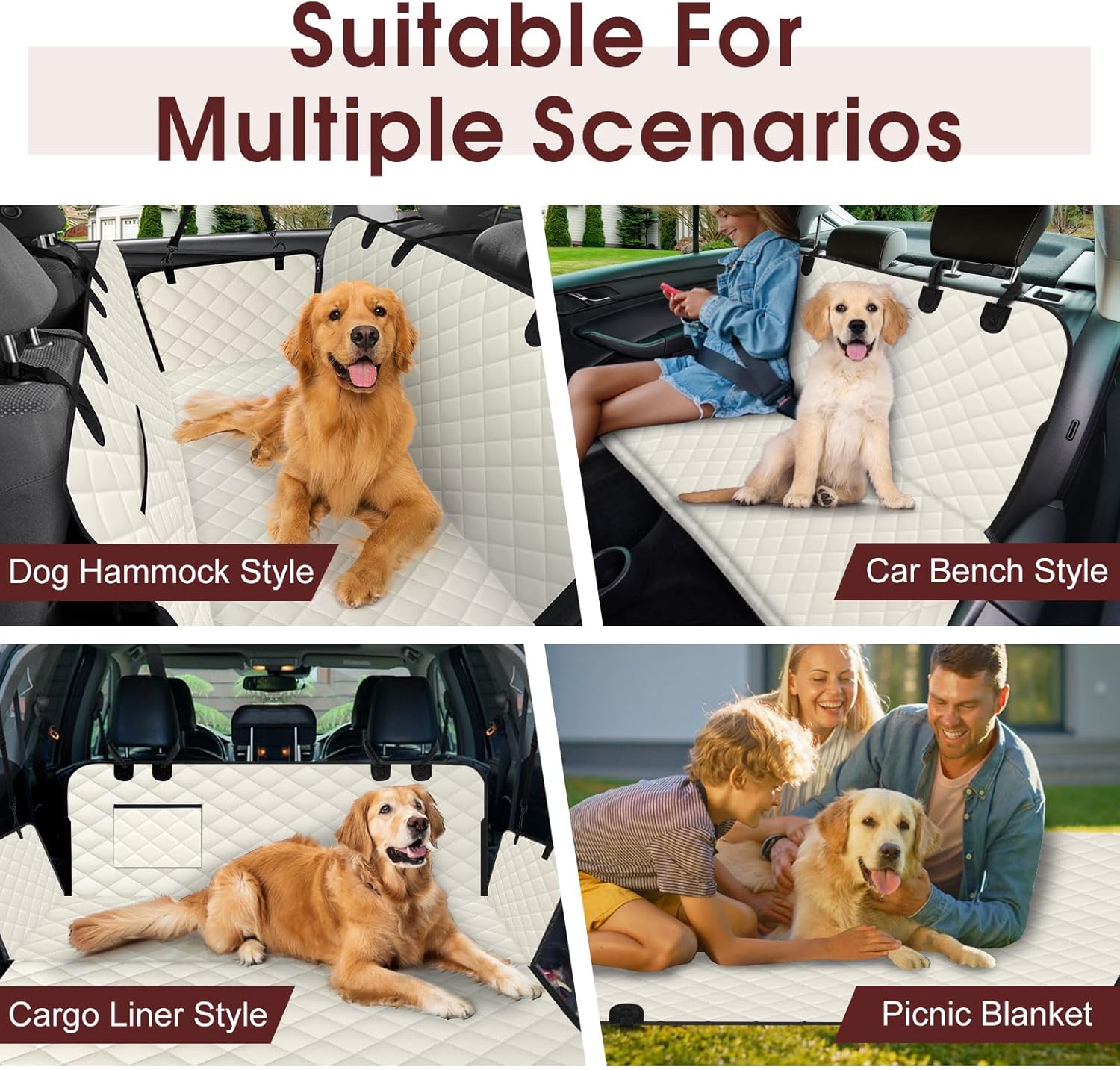 - ăMulti Functional UseăThe pet car seat cover is not only designed as a dog hammock with side wings. It can also be transformed into a car bench style or a cargo liner style. When this dog hammock for cars is fully unfolded, it can become a camping mat, allowing your family, friends, and pets to enjoy picnics together. Bring this multifunctional back seat pet cover and start your journey.