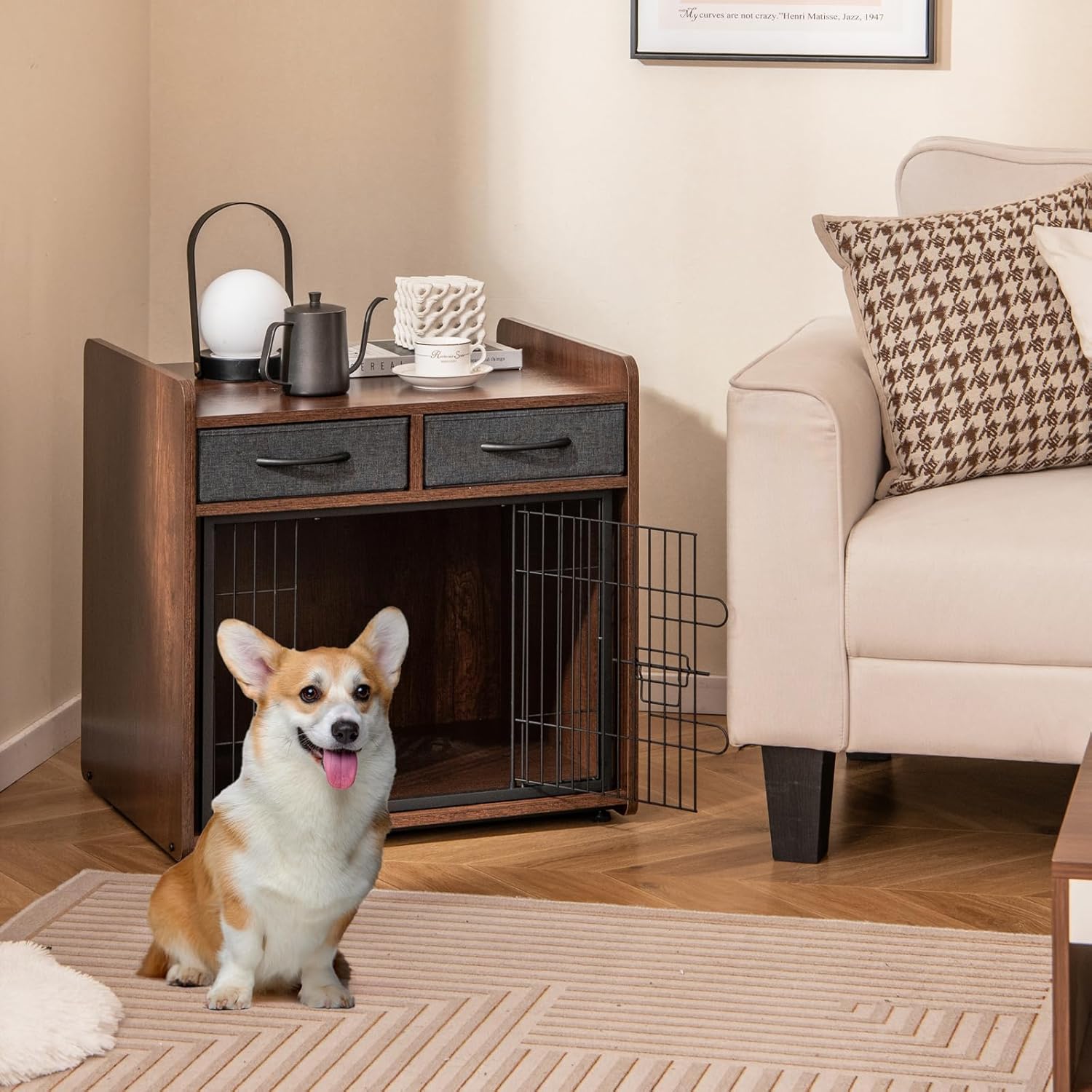 - 2 in 1 Multifunctional Design: This versatile dog crate is a wonderful piece of furniture for organizing your items and taking care of your pet. It can functions as an elegant end table in the living room or a comfortable dog crate for your furry friends.
