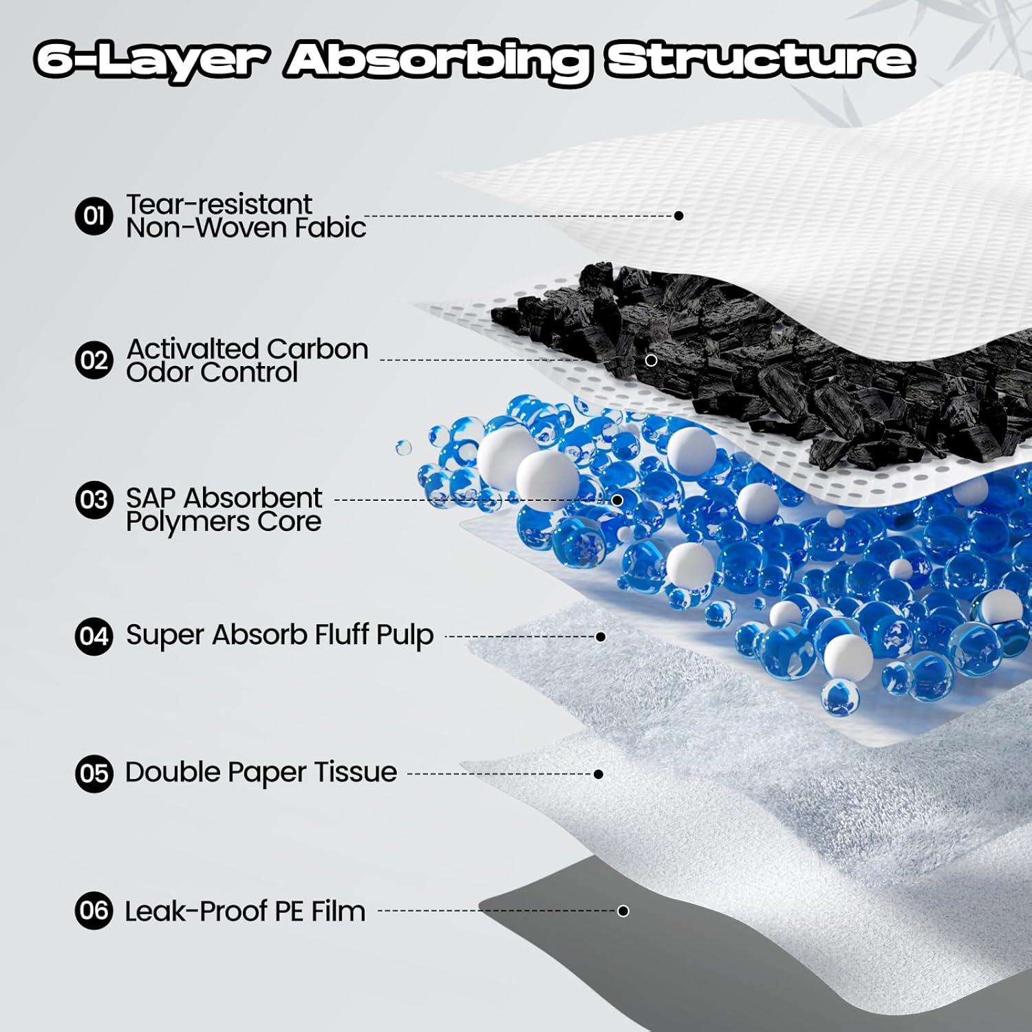 - đŚ´ăSuper Absorbent & Quick Dryingă6 layers of protection designed with polymers for super absorbency,converting liquid to gel in seconds for easy cleanup and staying dry.The non-woven fabric of the diaper pads accelerates liquid absorption and prevents reverse osmosis,keeping the surface dry quickly