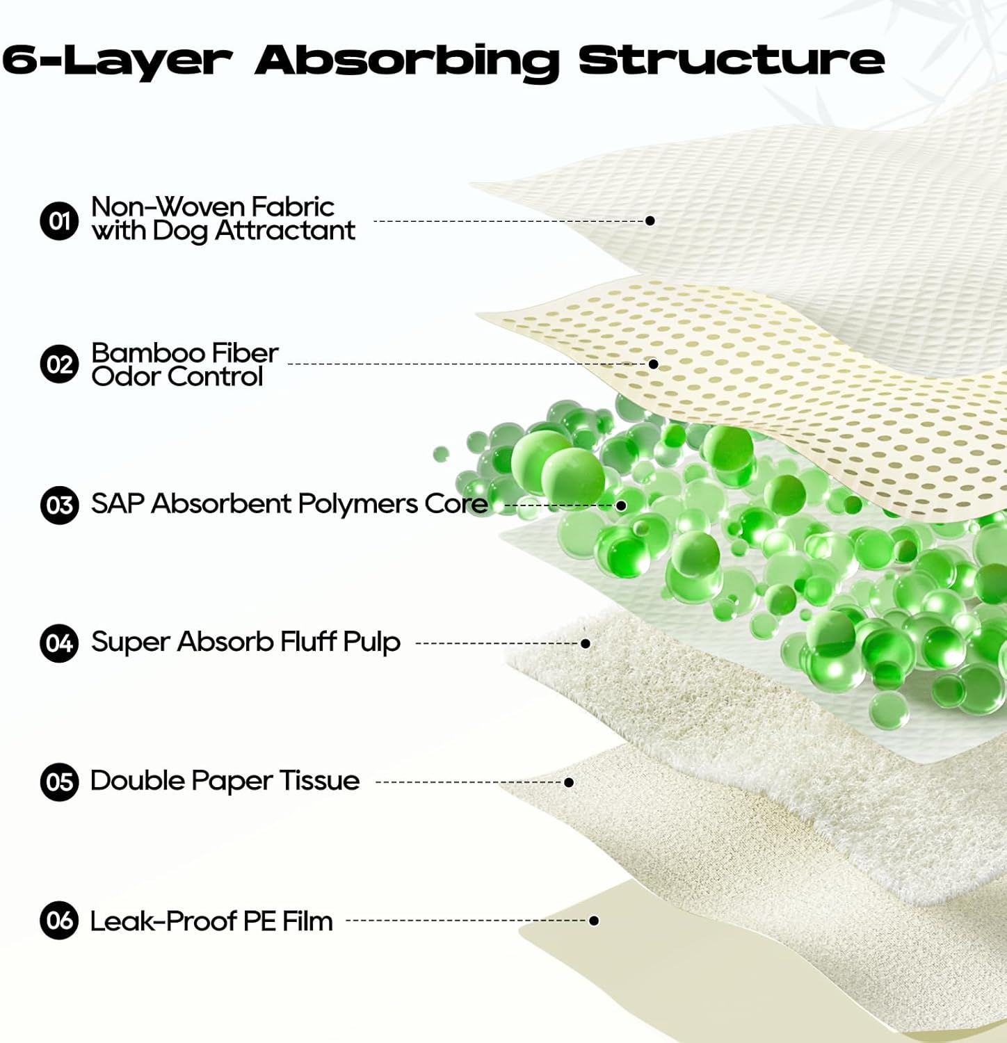- đŚ´ăThicken & Leak-Proof DesignăThe Potty Pads are thicker than others,it is more efficiently to prevent floor and carpet from pet urine damage,absorb liquid faster,up to 6 cups(600ml),upgraded thickened PE film is much more leak-proof,tear-resistant,and durable