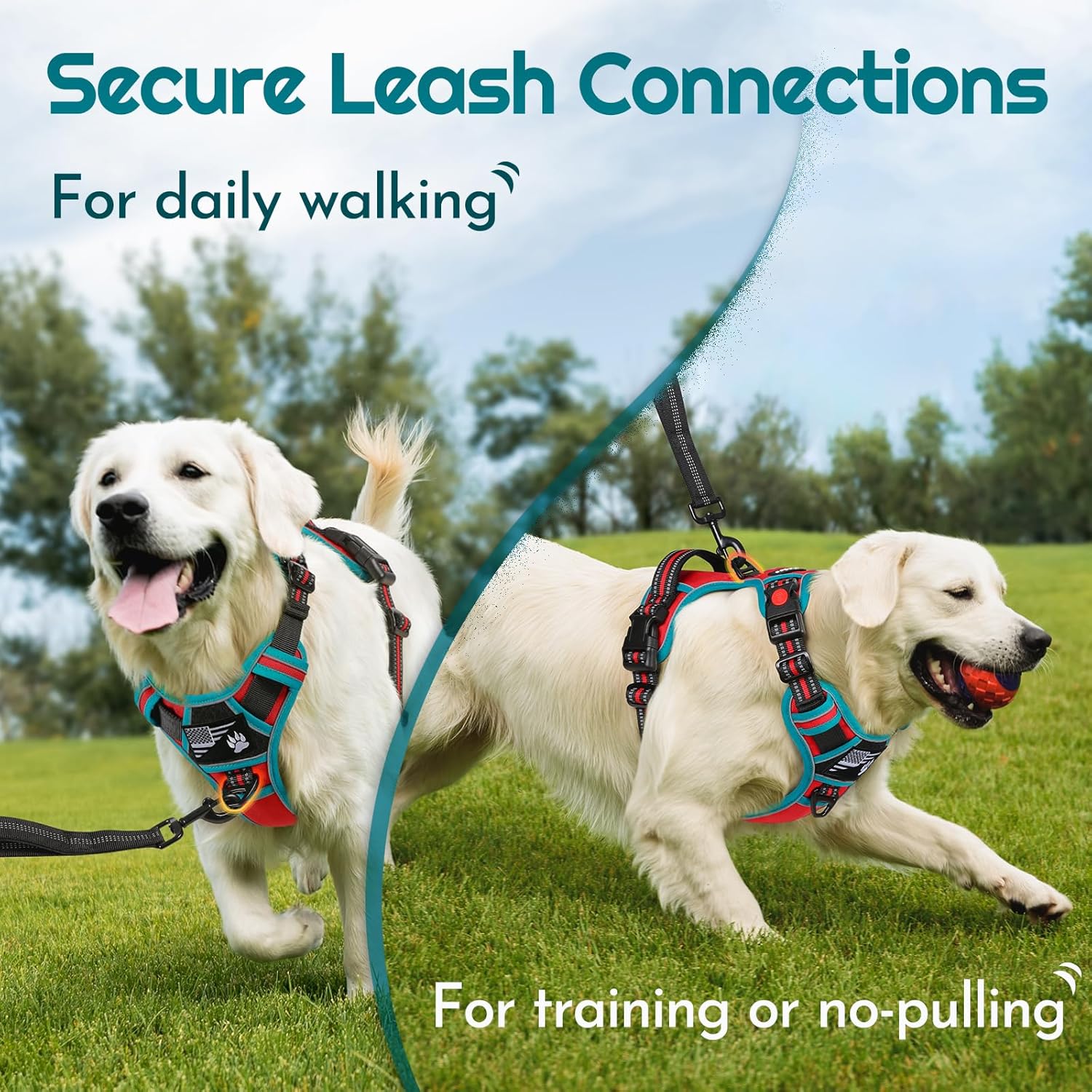 Eagloo Dog Harness for Large Dogs, Easy Wearing with 3 Buckles, Adjustable No Pull Pet Harness with 2 Rings for Walking, No Chock Reflective Soft Padded Vest with Control Handle, Red & Teal, XL
