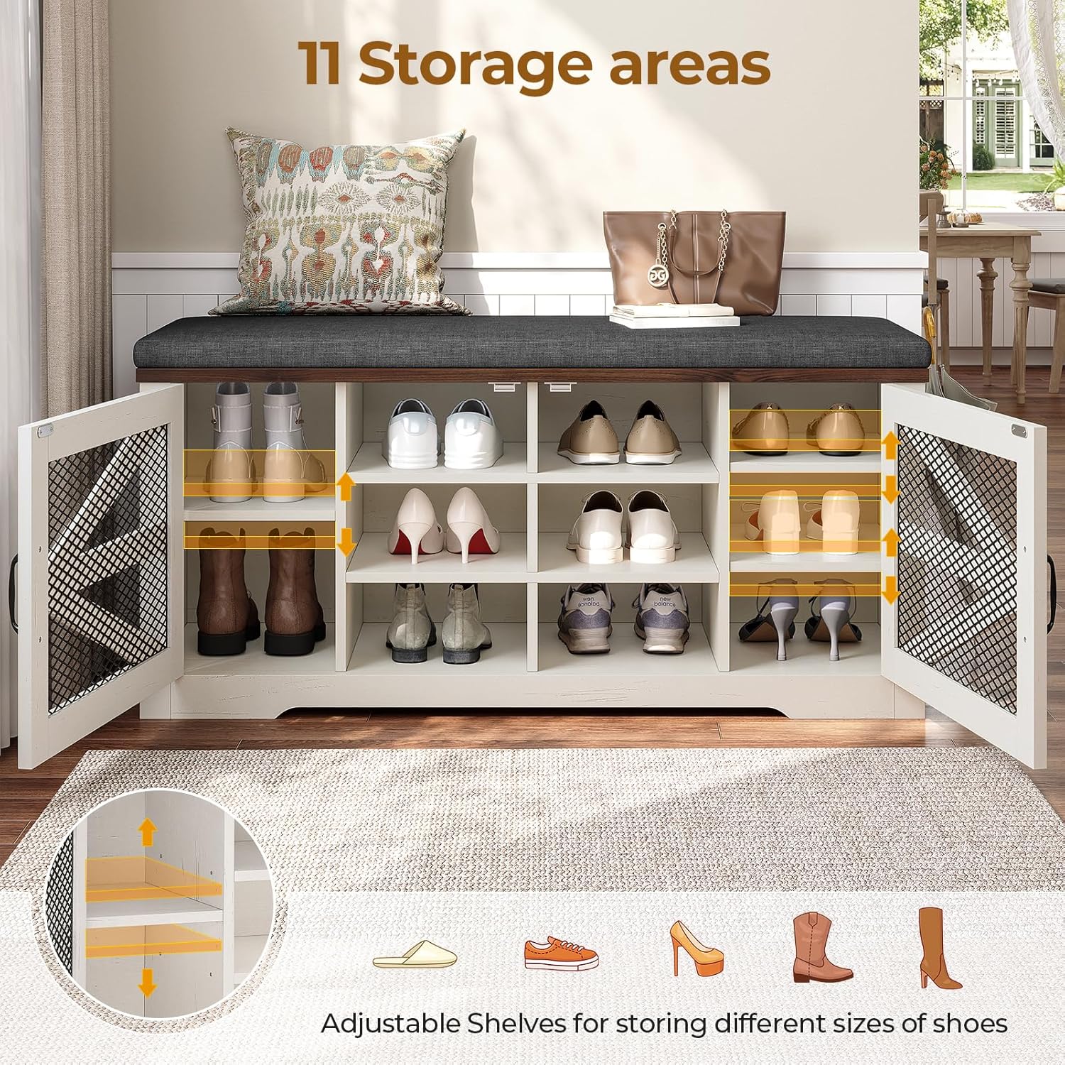 - COMFORTABLE AND CONVENIENT DESIGN: The adjustable layers of the shoe rack bench are designed to accommodate boots of different heights, and the two shoe changing benches are respectively allocated 8 and 11 storage spaces for shoes, providing you with a flexible comfort zone.