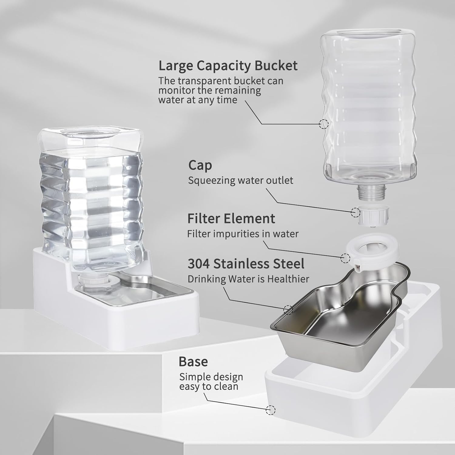 - [Excellent Material]Crafted with healthy and environmentally friendly PP material, this automatic pet waterer is odor-free and durable for long-term use. The drinking bowl is constructed from high quality 304 stainless steel, offering superior rust-proof and hygienic properties that outperform standard plastic cat water bowls and ceramic dog bowls. The transparent container design enables effortless water level monitoring, while the stainless steel cat water fountain-grade construction ensures clean and sanitary water for your pet's healthy growth.