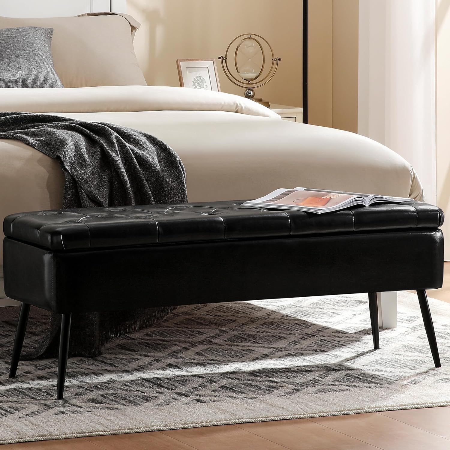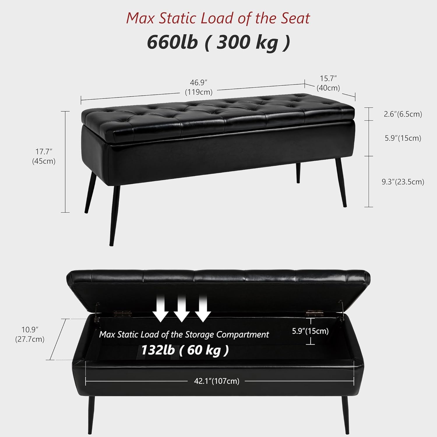 - STURDY AND SAFE: This end of bed bench features a solid wood frame supported by sturdy steel legs that can hold up to 660 pounds for durability. The lid-mounted opening and closing hinges are able to open and close slowly without worrying about overwhelming your hands.