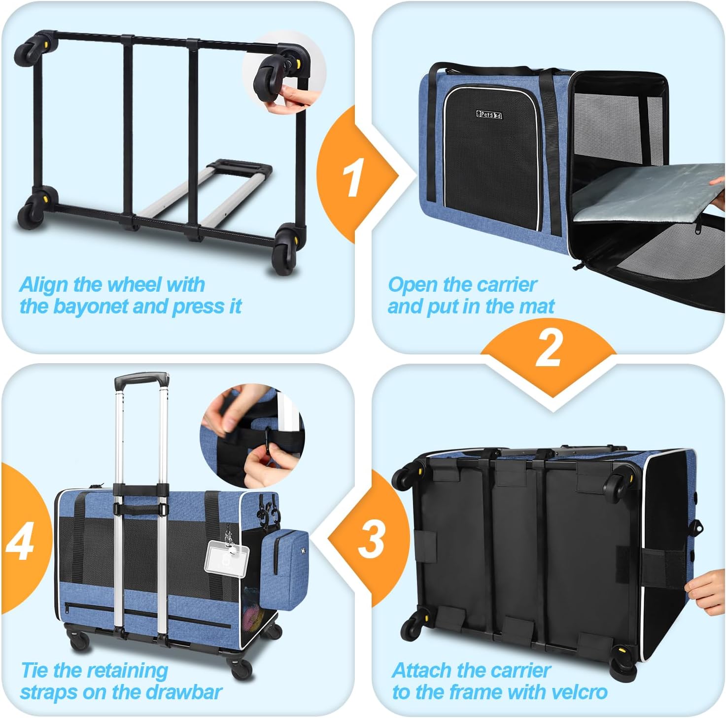 Petskd Extra Large Cat Carrier with Wheels and Litter Box 24"x17"x17" for Large Cat or 2 Small Cats, Collapsible Soft Sided Pet Carrier for Car Travel with Lockable Safety Zippers(Blue)