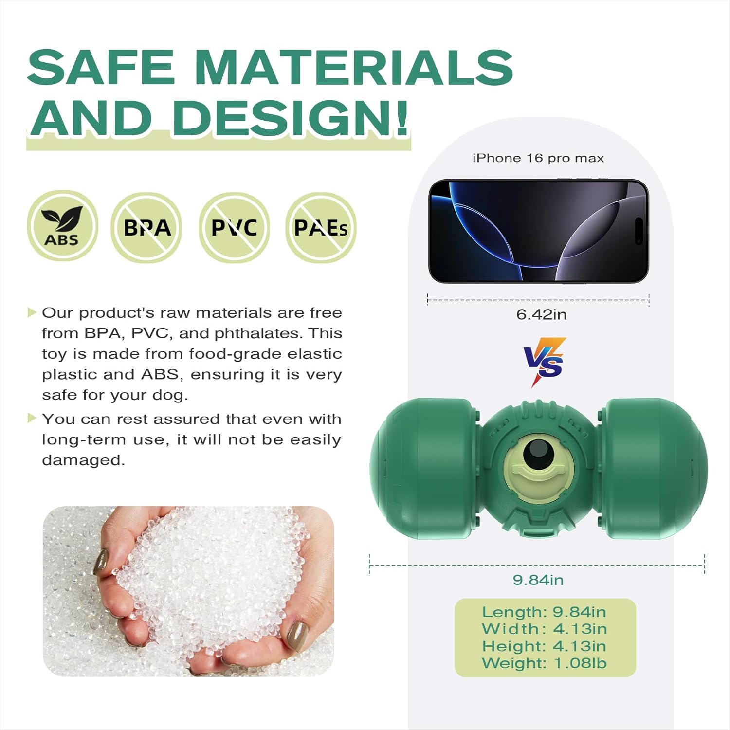 - [Safe Materials and Design]The product is made from BPA-free, PVC-free, and phthalate-free materials. It is crafted from food-grade ABS, ensuring both safety and durability. The toy is designed to withstand long-term use without easily breaking. All components are securely attached, eliminating any risk of accidental ingestion by your dog. You can use this toy with confidence.