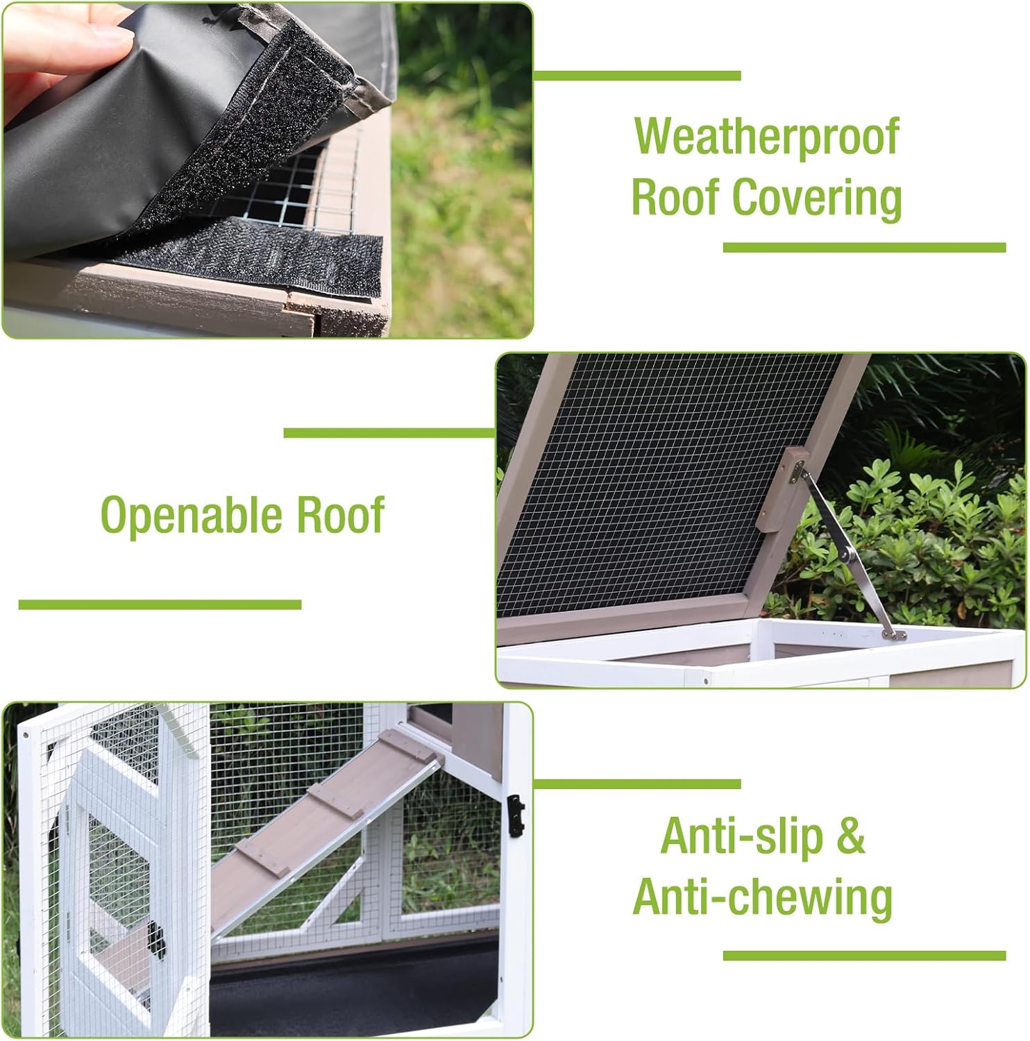 - Indoor and Outdoor: The openable roof allows for easy feeding and interaction. Plus, the waterproof covering shields your pet from the weather and offers shade, making this hutch perfect for both indoor and outdoor use