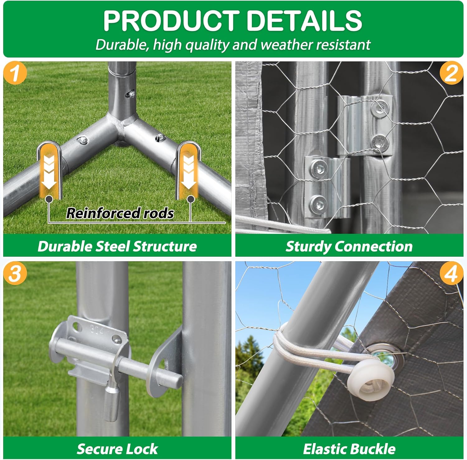- đ¤WATERPROOF COVER: The metal chicken coop comes with a canopy made of PE fabric, which is waterproof and UV resistant, ensuring your chickens are protected from the elements.