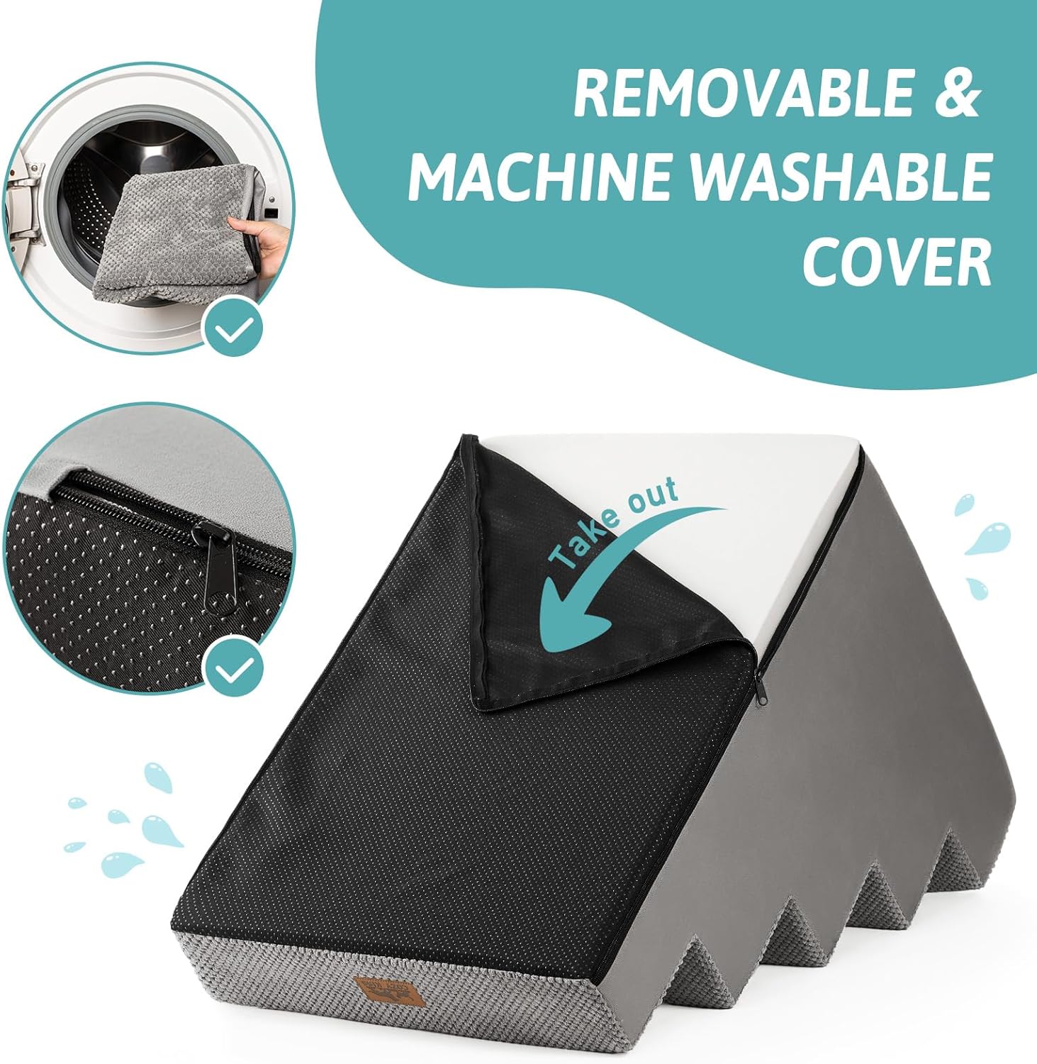 - Non-Slip Base and Removable Cover: Our dog steps for beds are equipped with a non-slip base featuring rubber dots for additional grip, minimizing movement during use. The pet steps cover is waterproof on the inner side, so you donât have to worry about stains seeping into the foam. The outer cover is removable and machine washable for easy cleaning