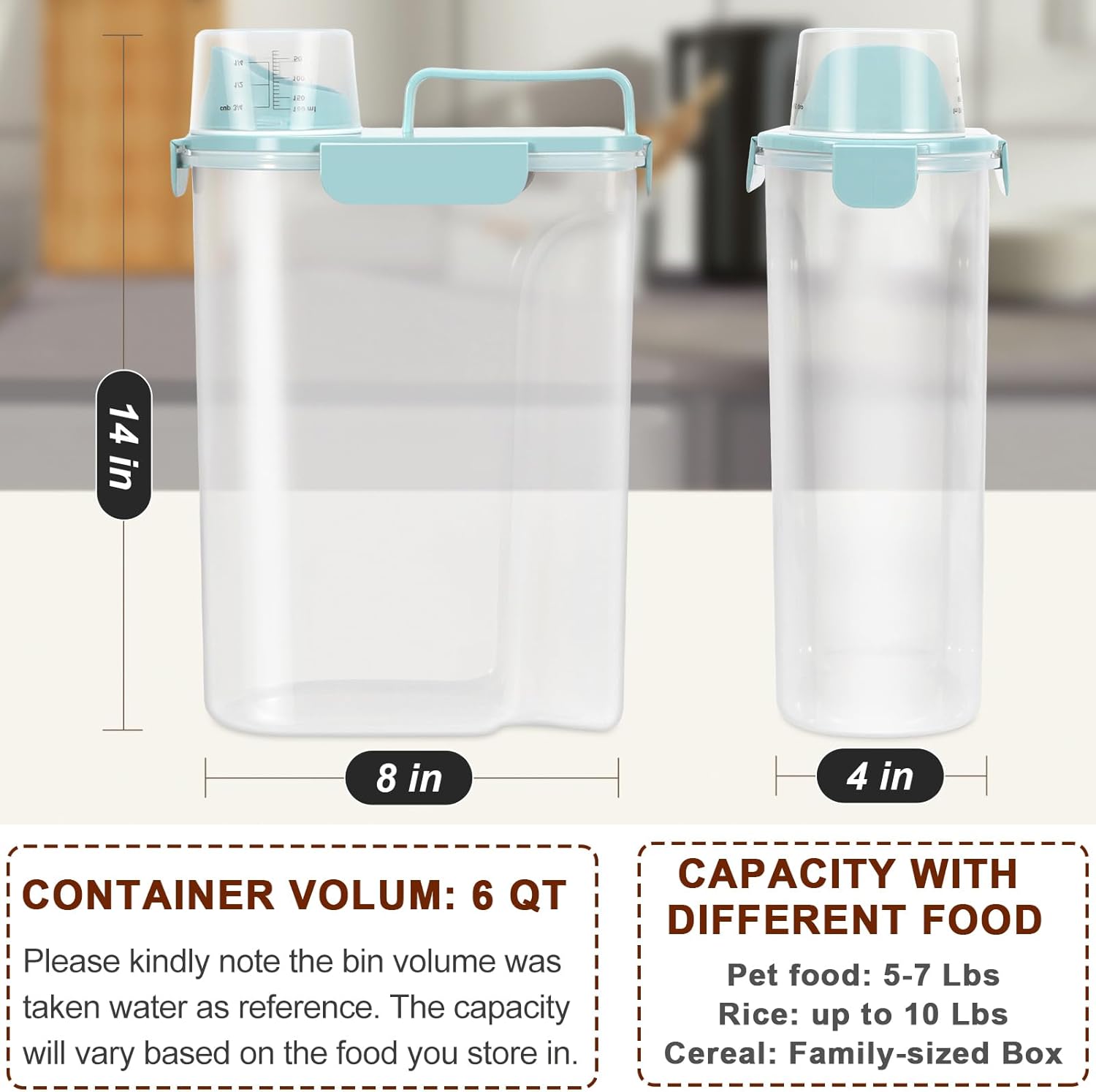 - Large Pet Food Container: The capacity of TBMax dog food storage container is 6-quart that can hold about a 5 -7 lbs bag of dry dog food or cat food, which depending on the particles of the pet food. Ideal for storing small pet food like kitten puppy kibble, bird seeds, fish food and more