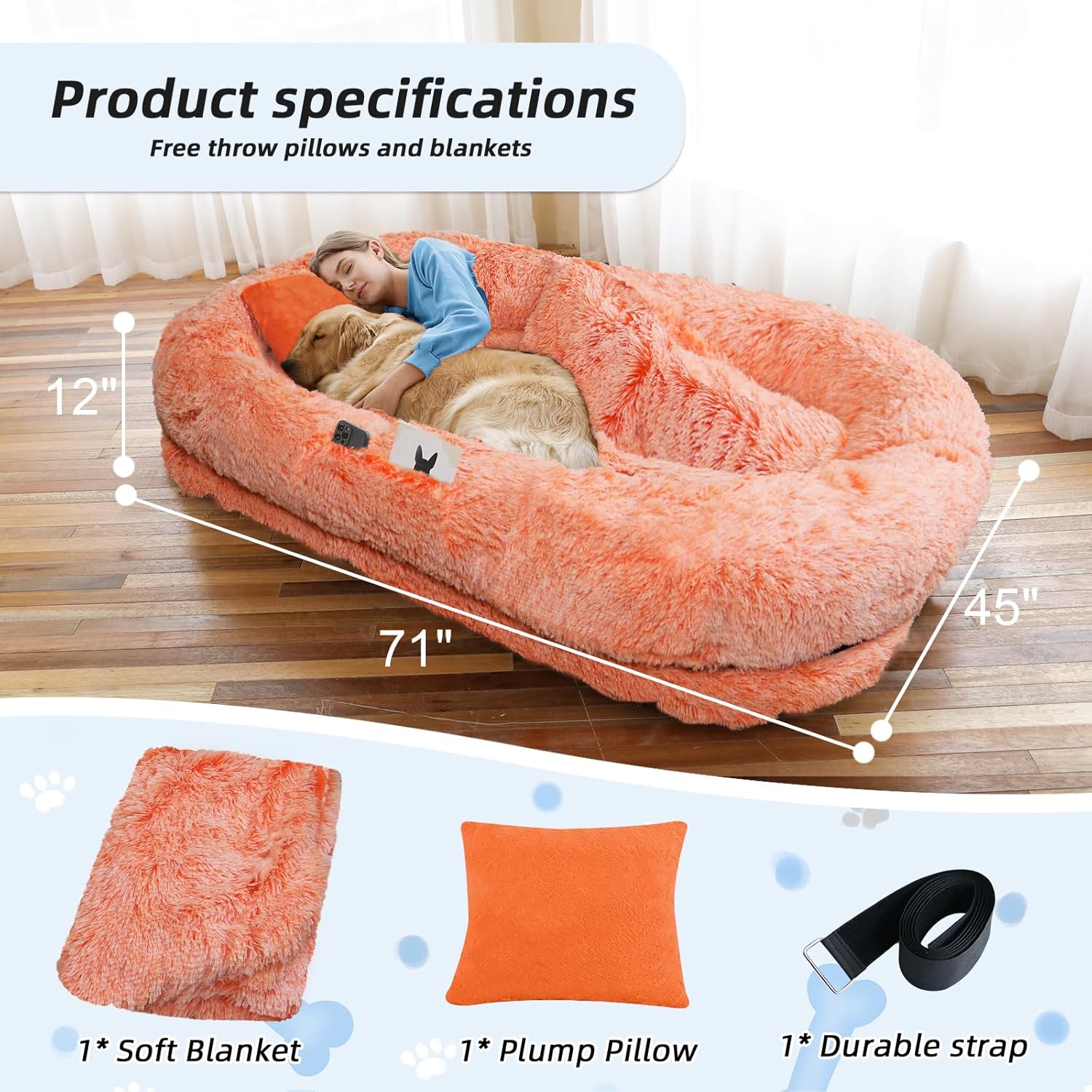 Human Dog Bed, 71''x45''x12'' Size Fits You and Pets, Washable Faux Fur Pet Bed for People Doze Off, Napping Orthopedic Dog Bed, Present Plump Pillow, Blanket, Strap - OrangeWhite