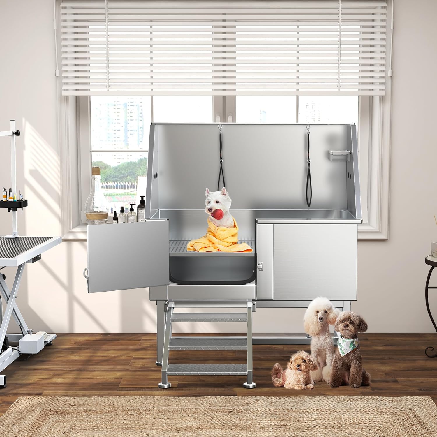 YITAHOME Dog Bathing Station, Professional Stainless Steel 304 Dog Grooming Bathtub w/Left Stairs, Faucet, Floor Grate, 50in Pet Washing Station for Large, Medium, Small Pets
