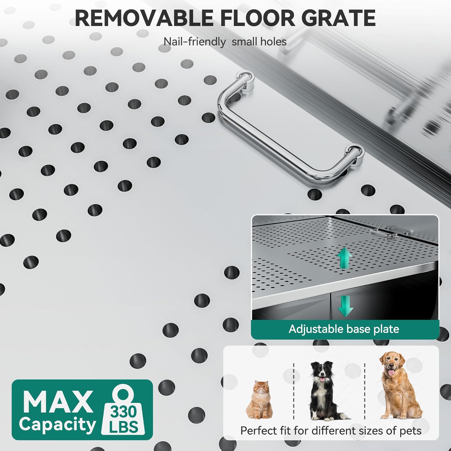 - Enhanced Drainage System: Our pet wash station is designed with a chrome-plated extendable drain, offering durability and an aesthetic appeal; The two-tier adjustable floor accommodates pets of all sizes, providing a complete and enjoyable bathing experience