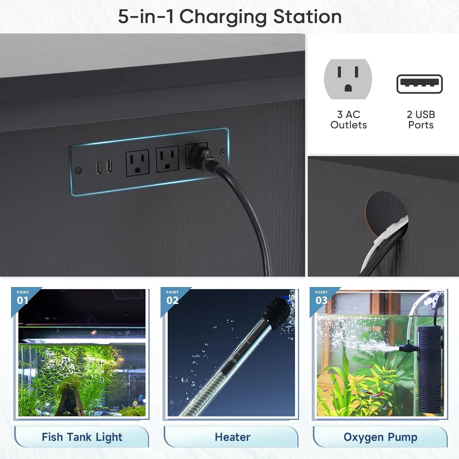 - 【Convenient Power Management】-This fish tank stand boasts a built-in power strip with 3 outlets and 2 USB ports, which make it easy to connect electronic devices: lights, heaters, and oxygen pumps, etc. Plus a cable hole for discreet cord routing, simplifying your fish tank management.