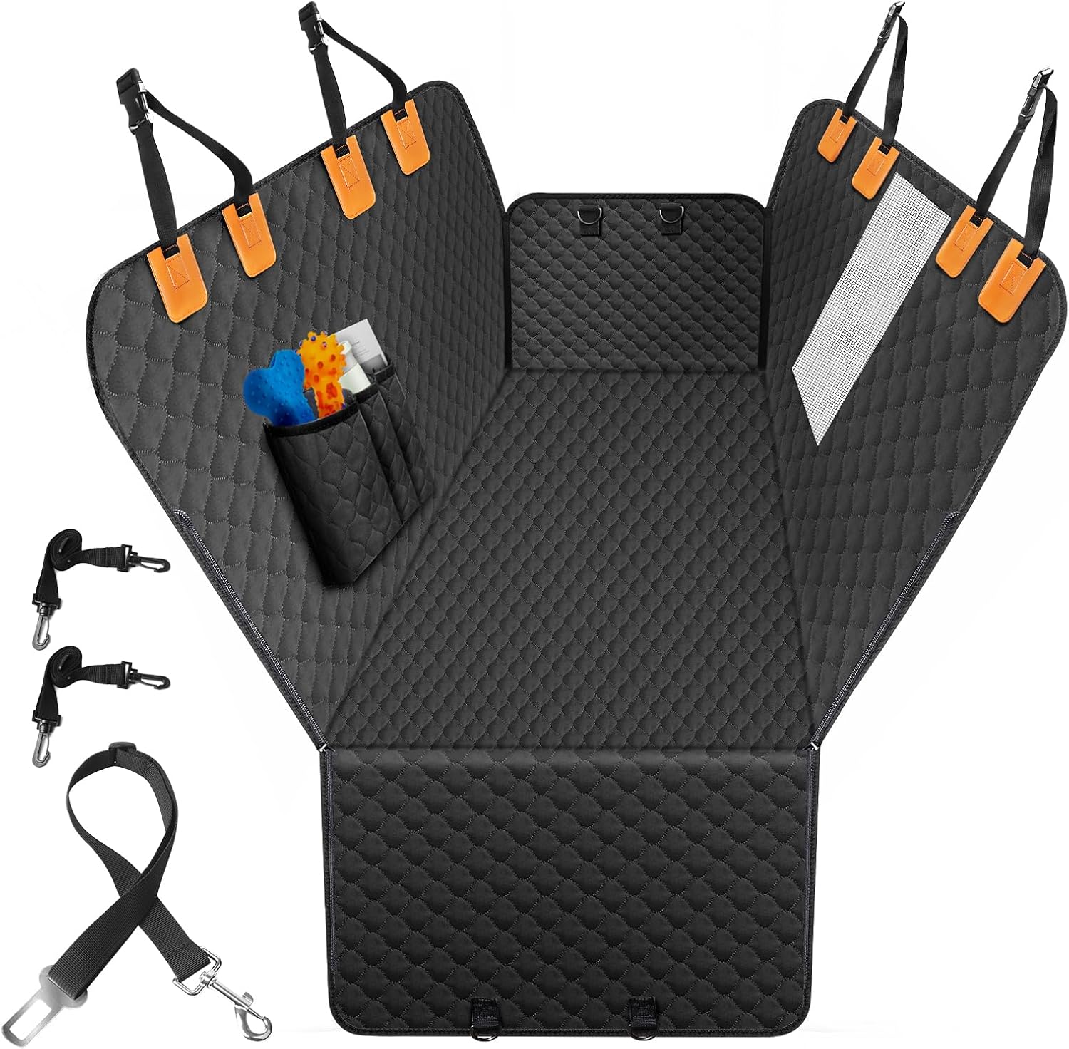 - Water-Resistant & Durable: Made with high-quality 600D polyester in the center and lightweight 420D polyester on the sides, this car dog cover provides a water-resistant layer, preventing stains, dirt, and moisture from damaging your carâs upholstery. It also works well as a protection layer for baby car seats.