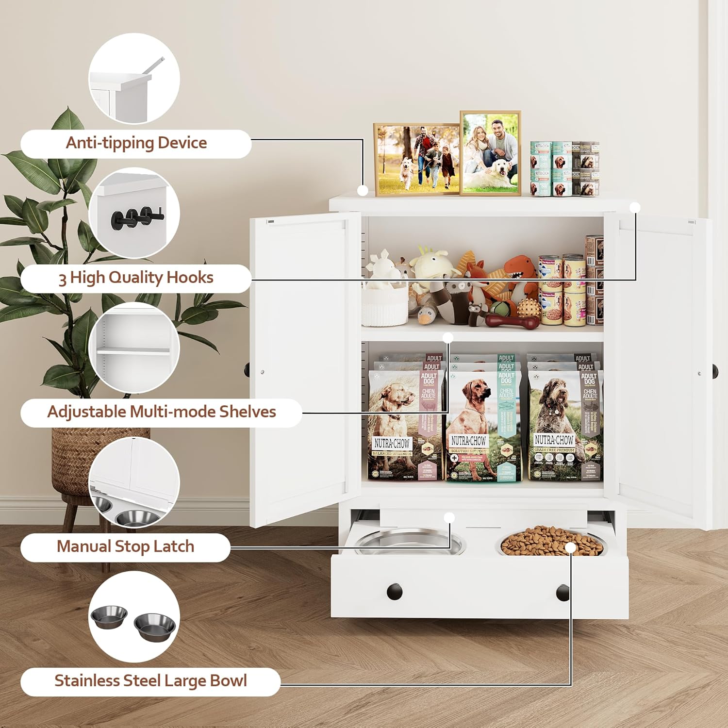 - Versatile Dog Food Cabinet Feeding Station: This dog food cabinet feeding station is perfect for a variety of settings, including kitchens, entryways, and hallways. Its compact yet spacious metal design ensures itâs durable for both indoor and outdoor use, helping to keep your petâs feeding area organized and clutter-free.