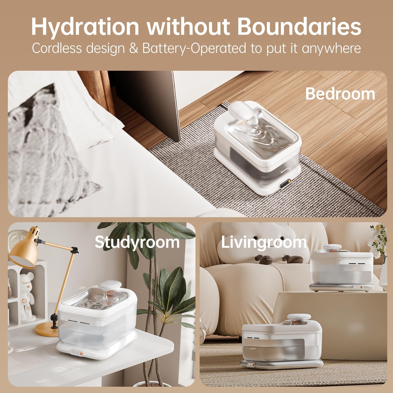 - Cordless Design – Electromagnetic induction pump and cordless base allow flexible placement without exposed cords. Clean and clutter-free setup ideal for indoor use.