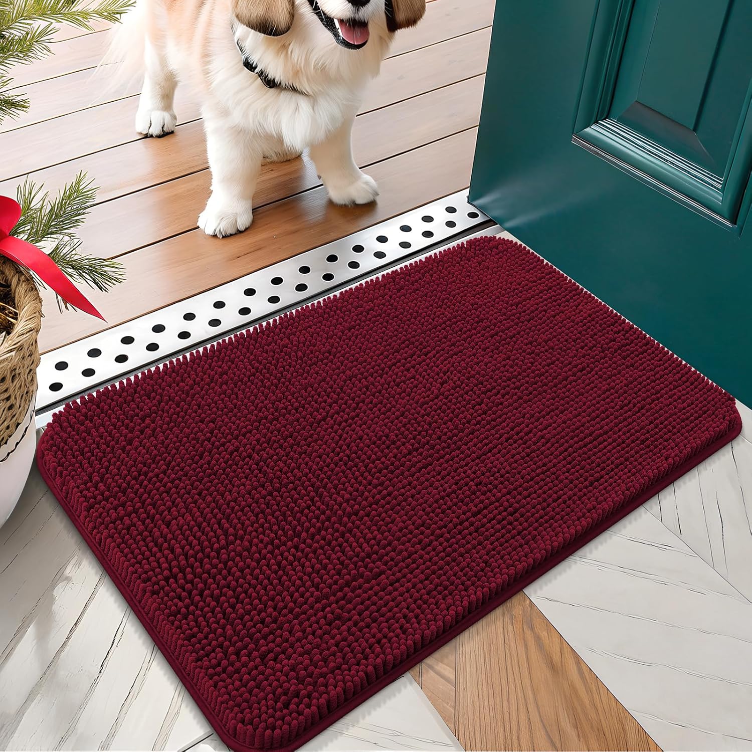 OLANLY Dog Door Mat for Muddy Paws 30x17, Absorbs Moisture and Dirt, Absorbent Non-Slip Washable Doormat, Quick Dry Chenille Mud Mat for Dogs, Entry Indoor Entryway Carpet for Inside Floor, Burgundy
