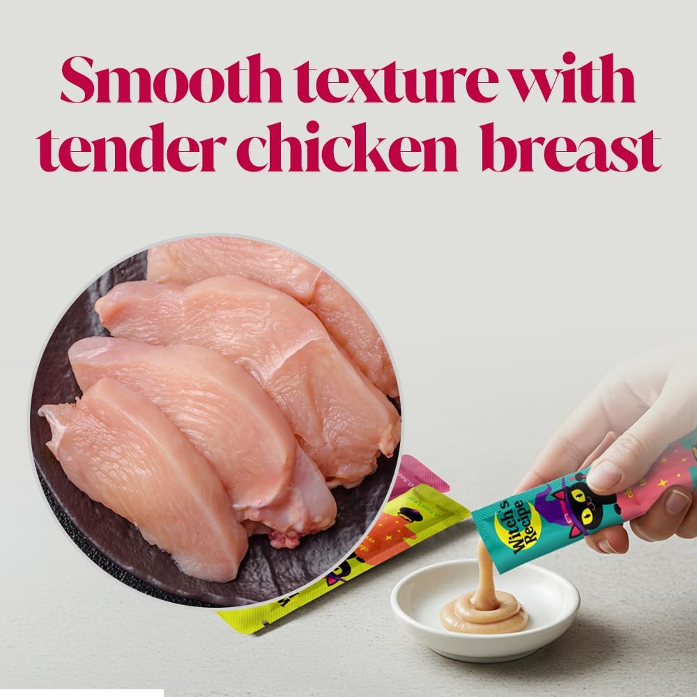 Witch's Recipe Lickable Cat Treats, Creamy Squeezable Puree, Grain-Free, 100 Tubes, Chicken Tuna Salmon goatmilk Capelin Flavors 0.5oz Each Tube