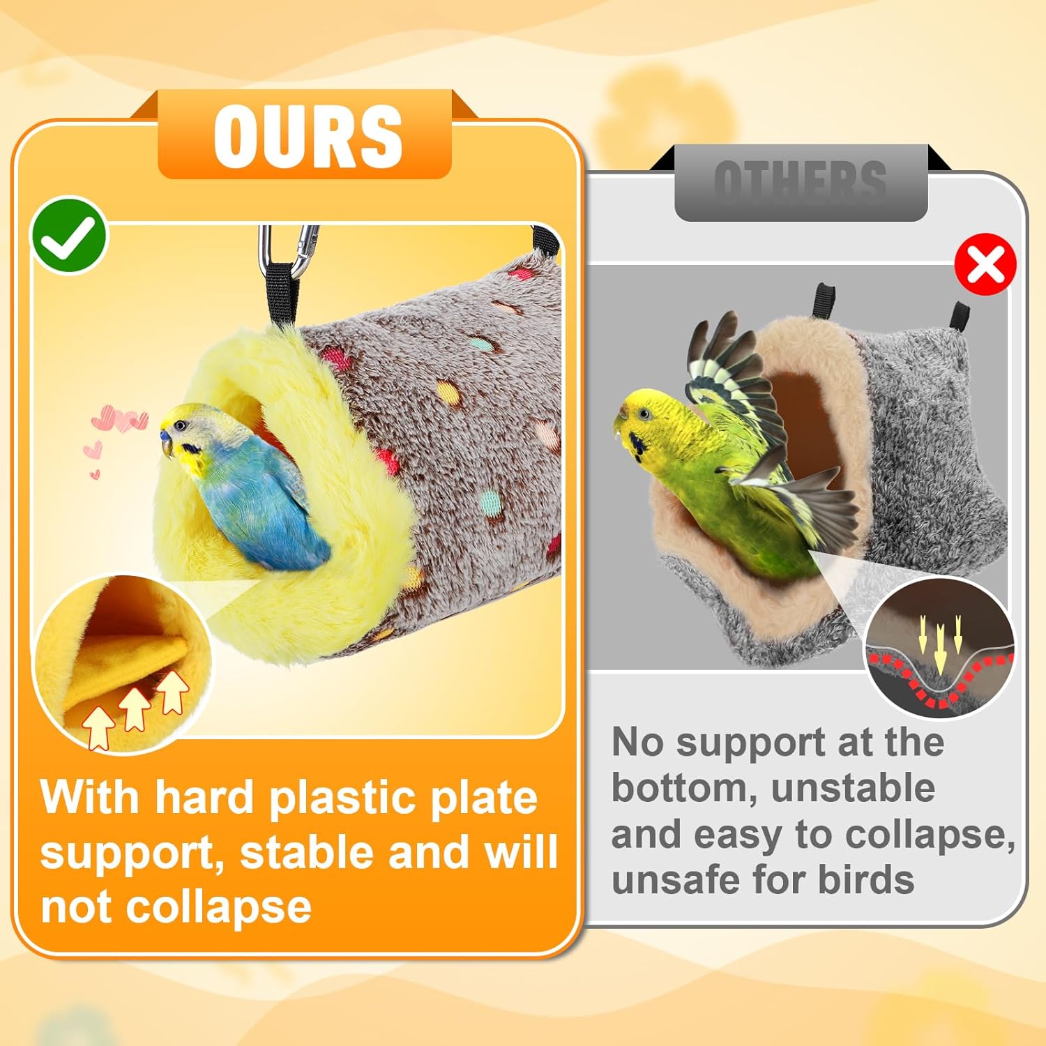 - Warm Material: Made of reliable plush material that is soft, comfortable and warm. The yellow lining enhances the cozy appearance, attracting birds to enter willingly. Additionally, it is a perfect accessory for decorating bird cages or homes.