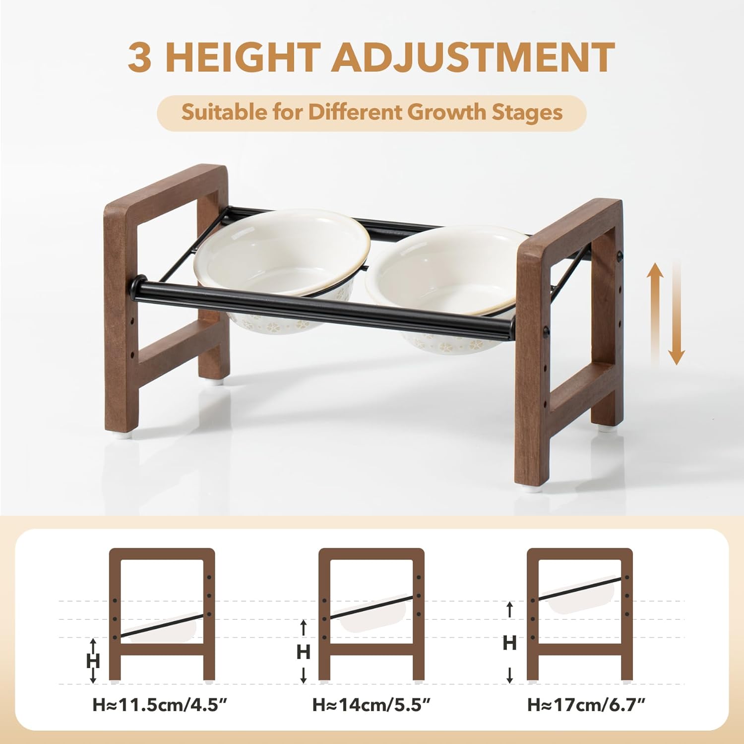 - 3 Adjustable Heights & 2 Placement Options: This stand offers 3 adjustable heights, ranging from 5.5 inches to 8.7 inches, catering to the needs of pets at different growth stages. The circular metal component on top of the stand features two distinct placement options, allowing the bowls to be either horizontally aligned or tilted. Our products are designed to help protect the pet's cervical spine and meet their diverse needs.